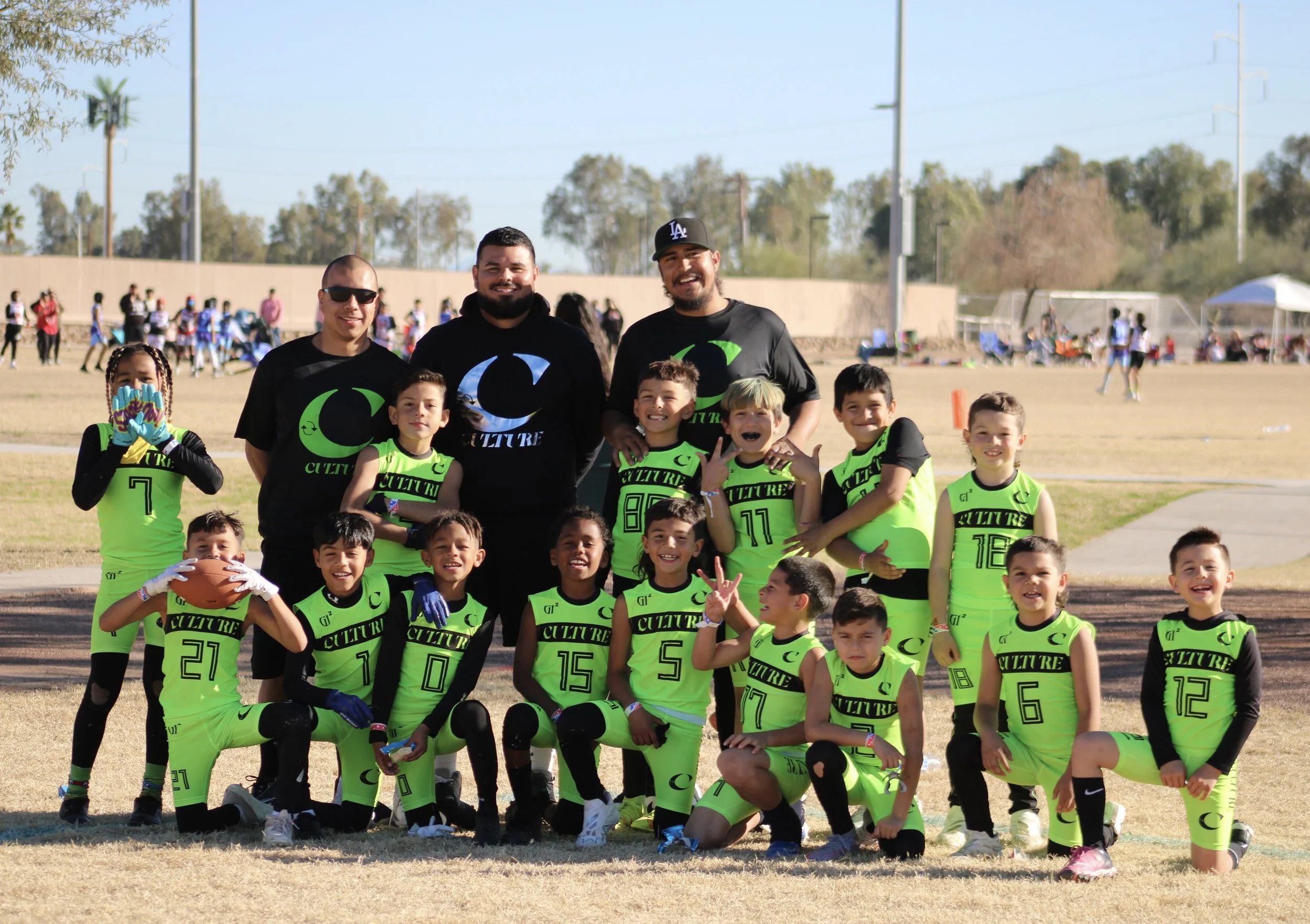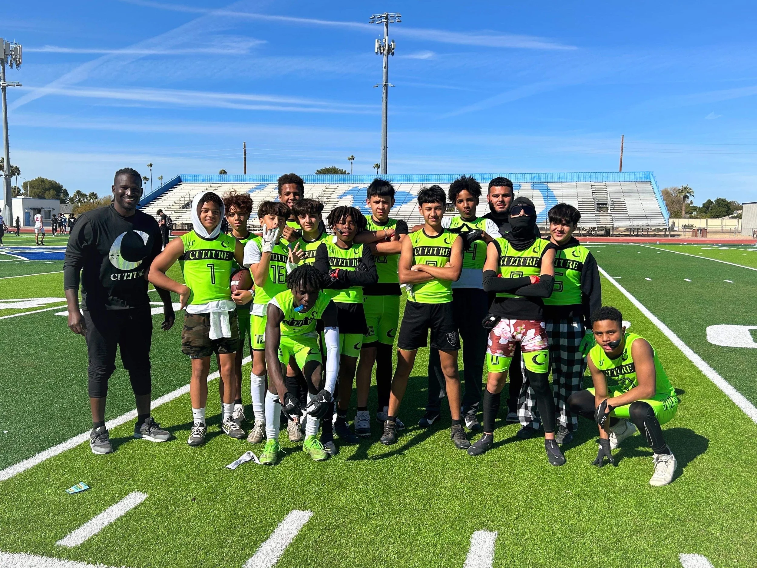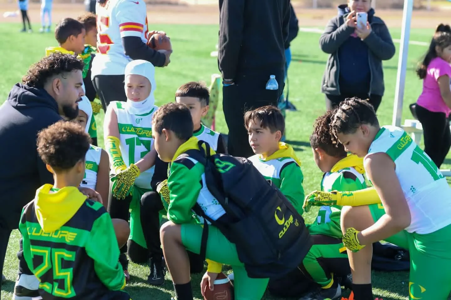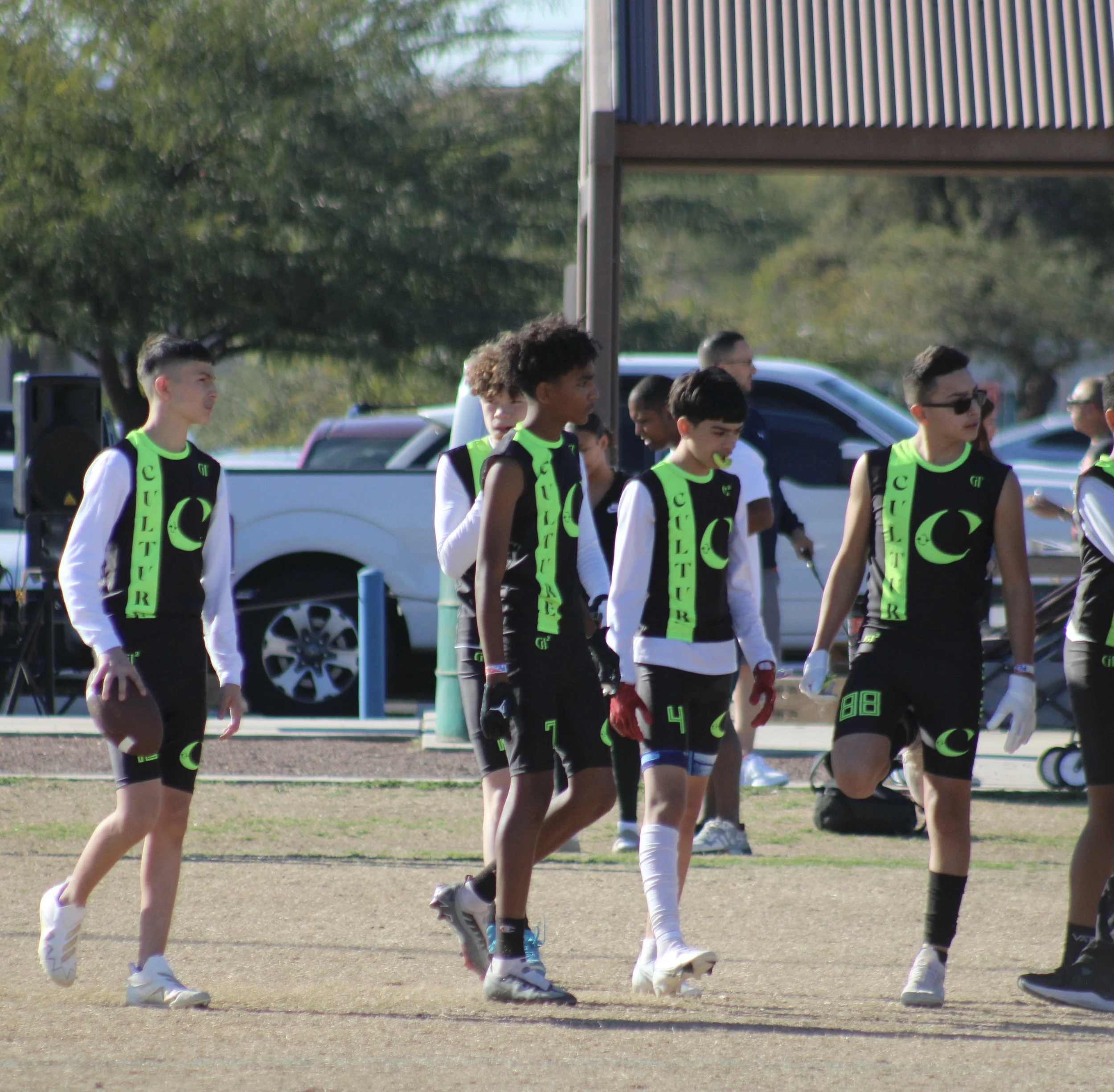 Group of young football players on the field, wearing black and neon green uniforms with the words 'CULTURE' and a crescent moon logo.