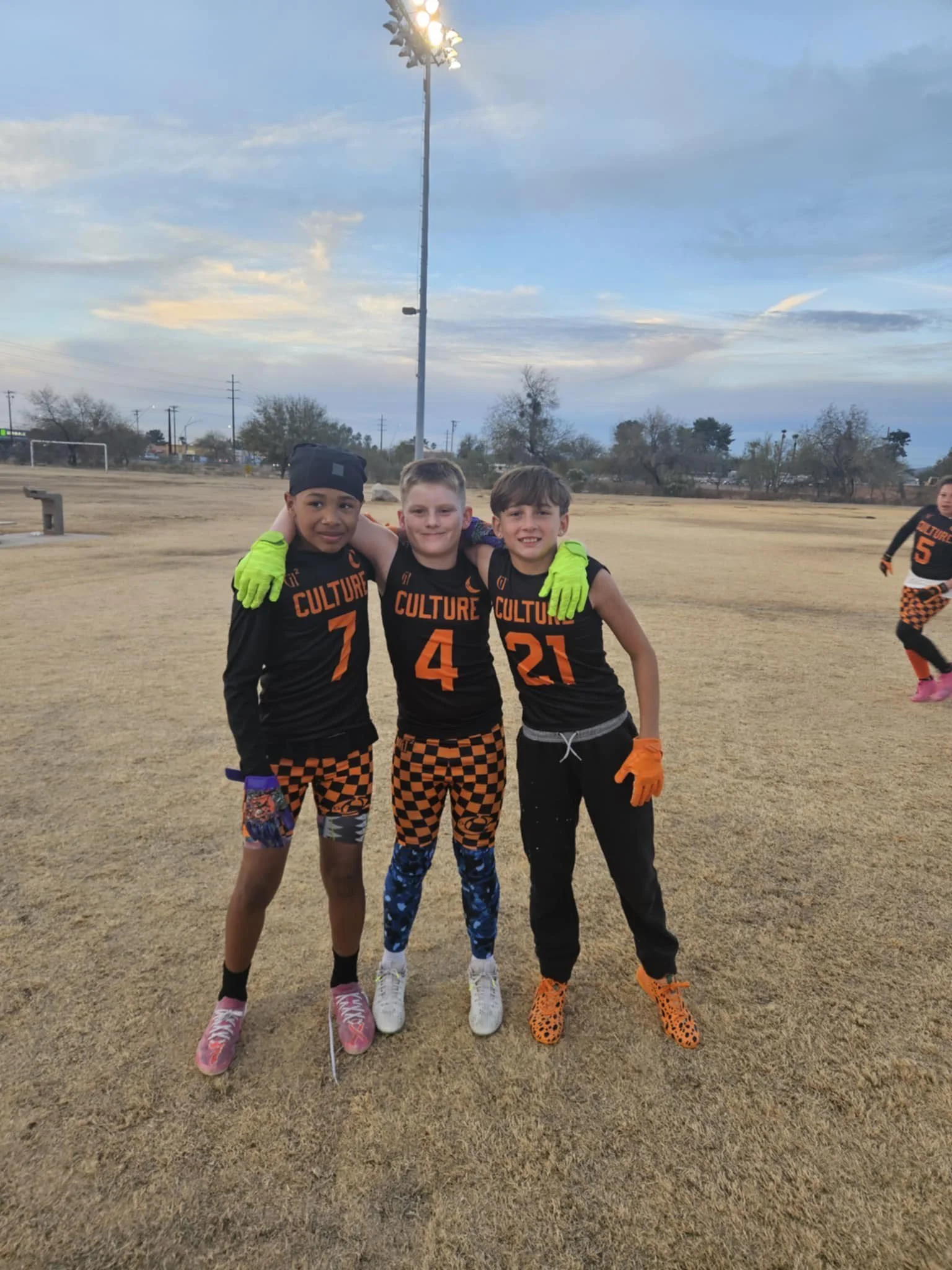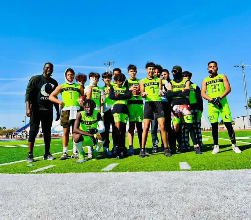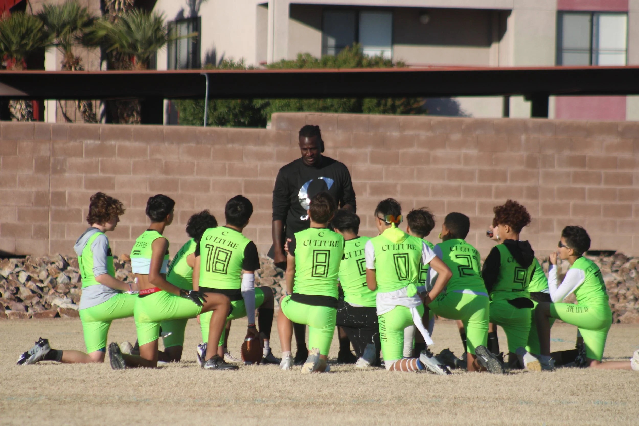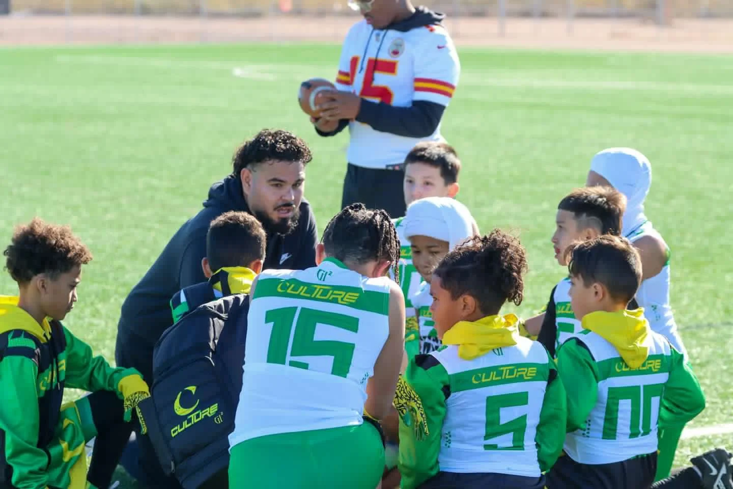 Group of young football players on the field, wearing black and neon green uniforms with the words 'CULTURE' and a crescent moon logo.