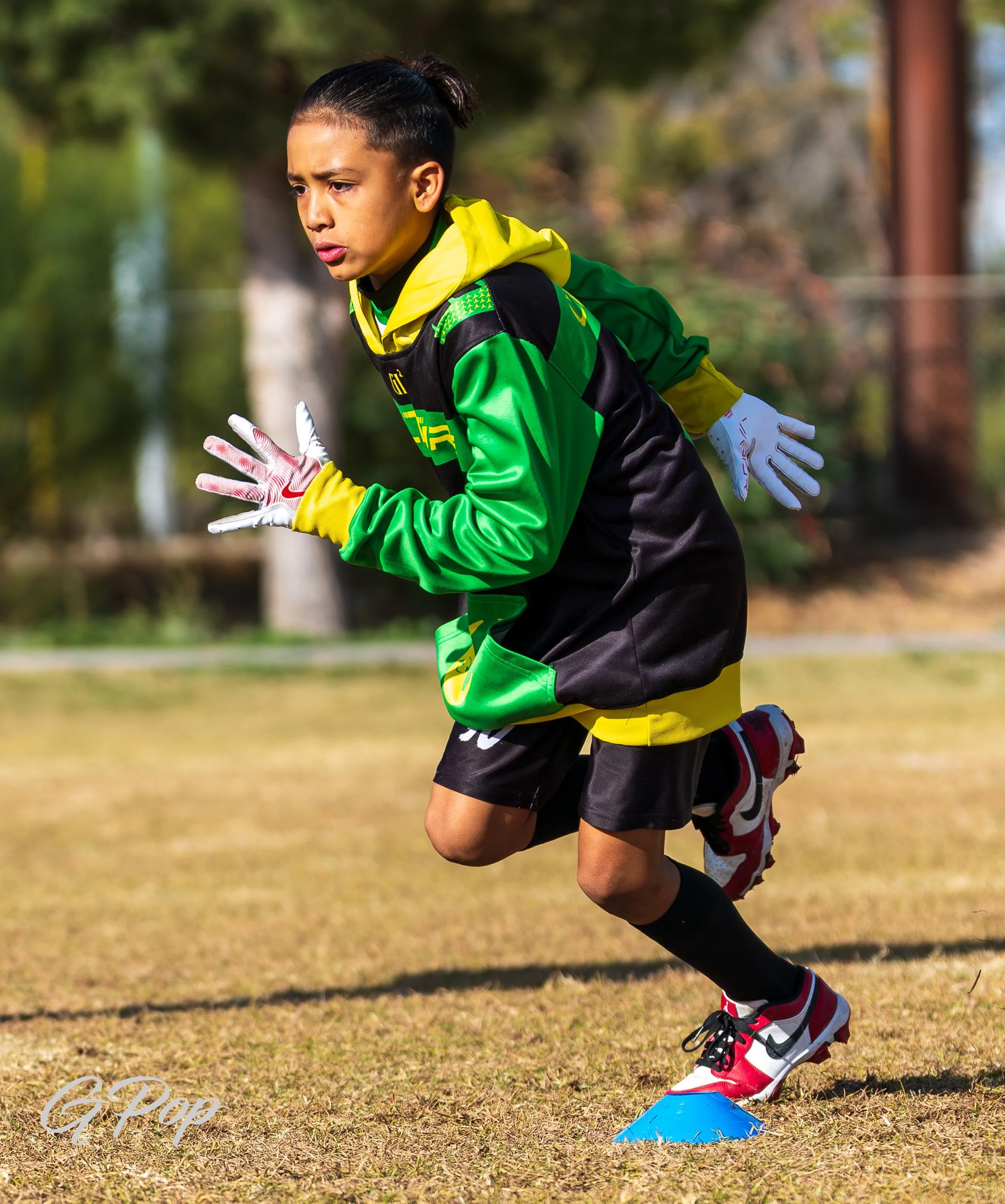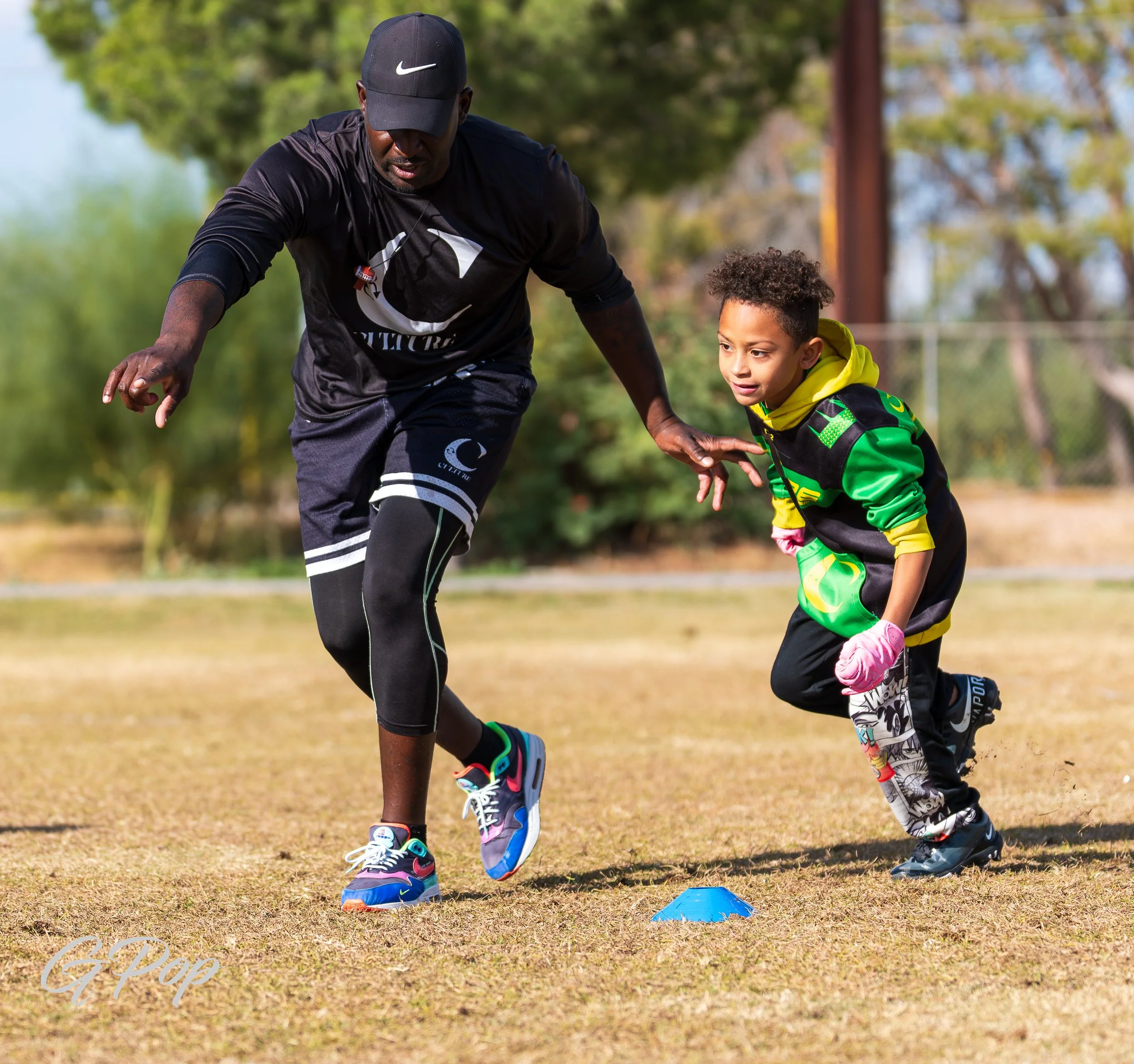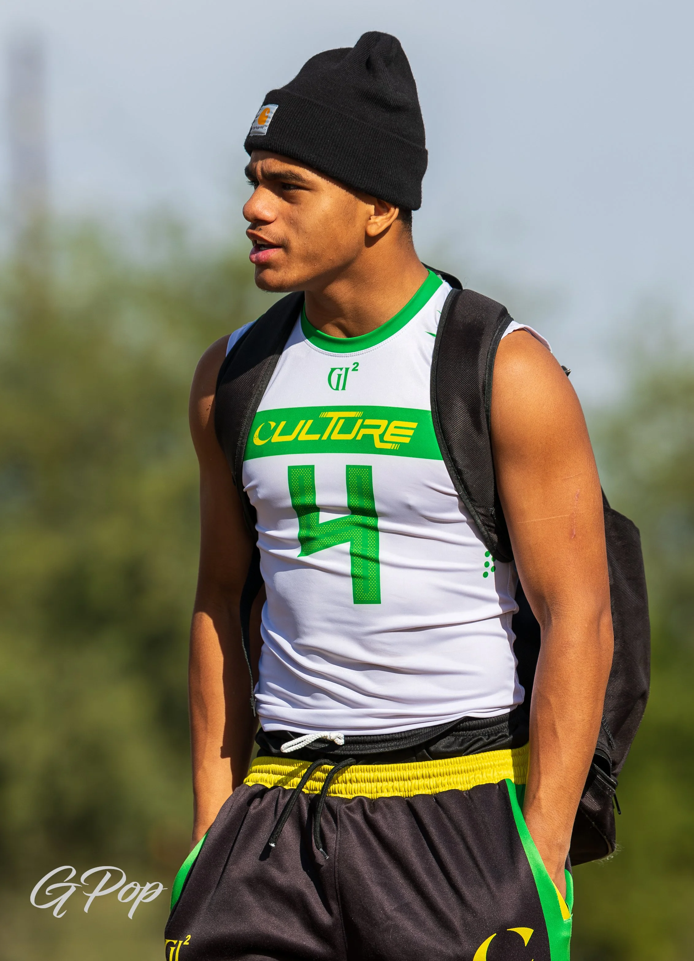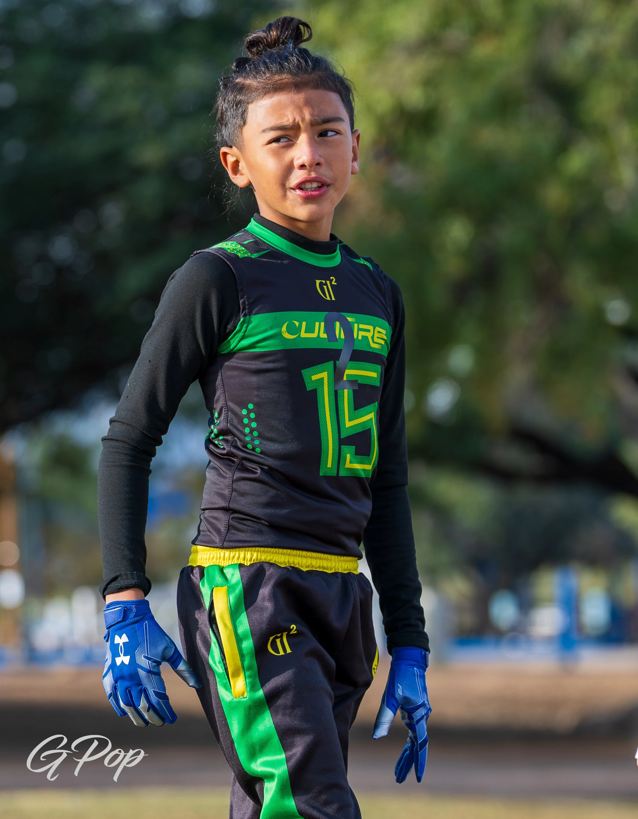 Group of young football players on the field, wearing black and neon green uniforms with the words 'CULTURE' and a crescent moon logo.