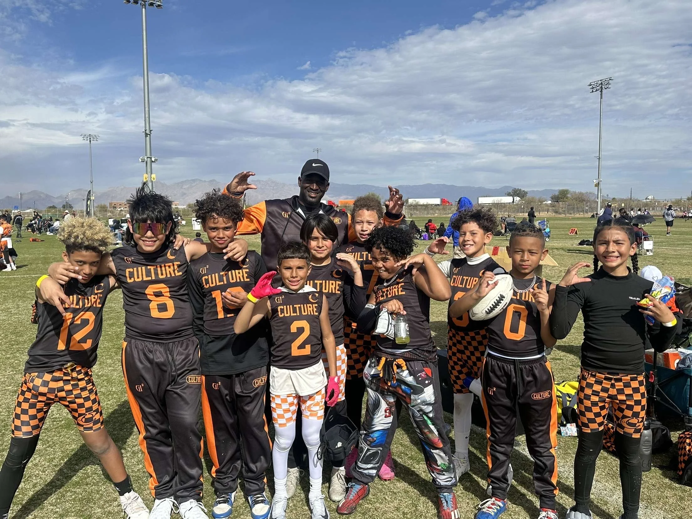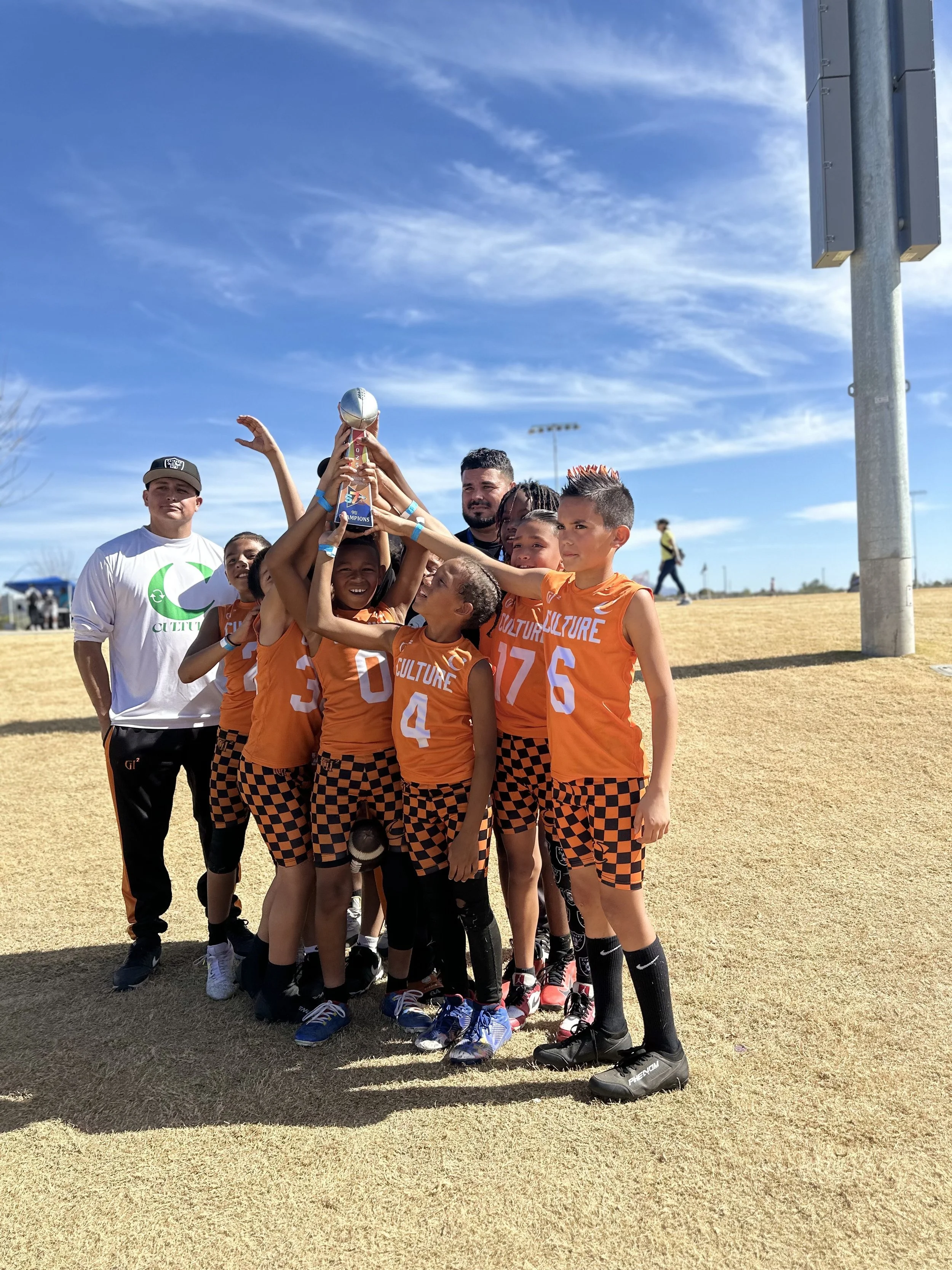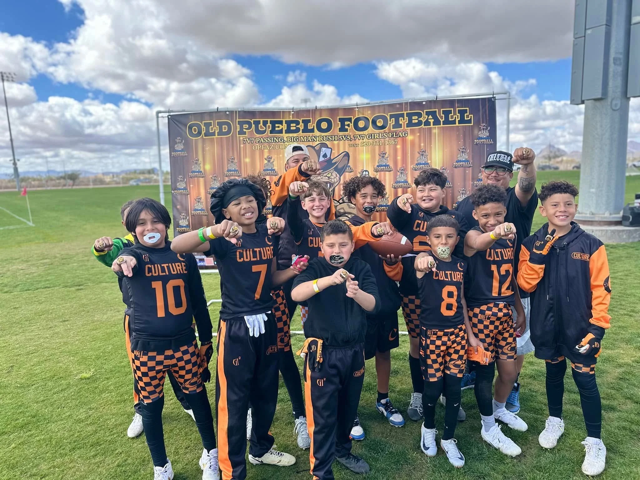 A youth football team in black and orange uniforms with the word 'CULTURE' on the front, posing on a football field with a coach and a banner that says 'Old Pueblo Football'. The team is celebrating with fists in the air.