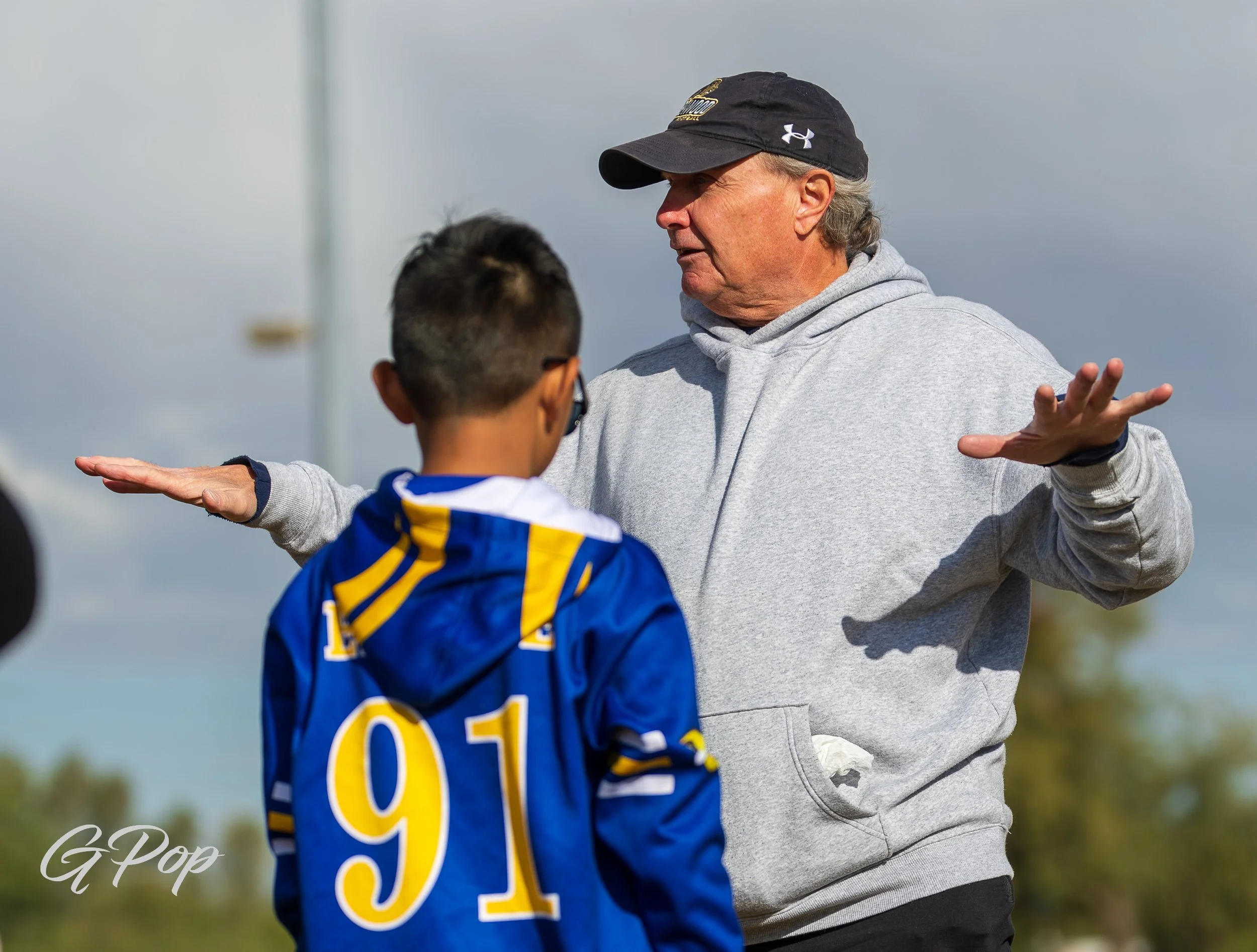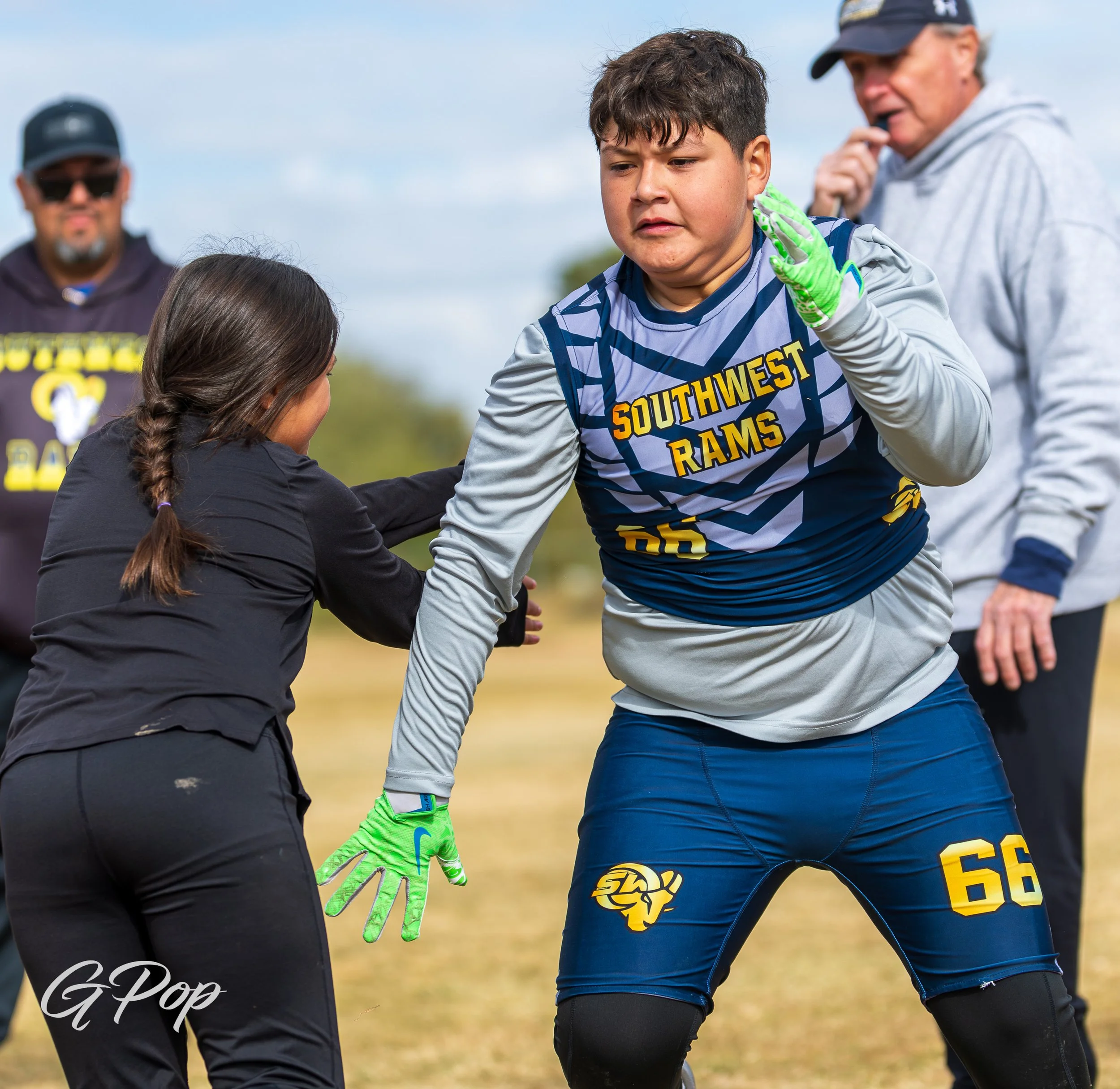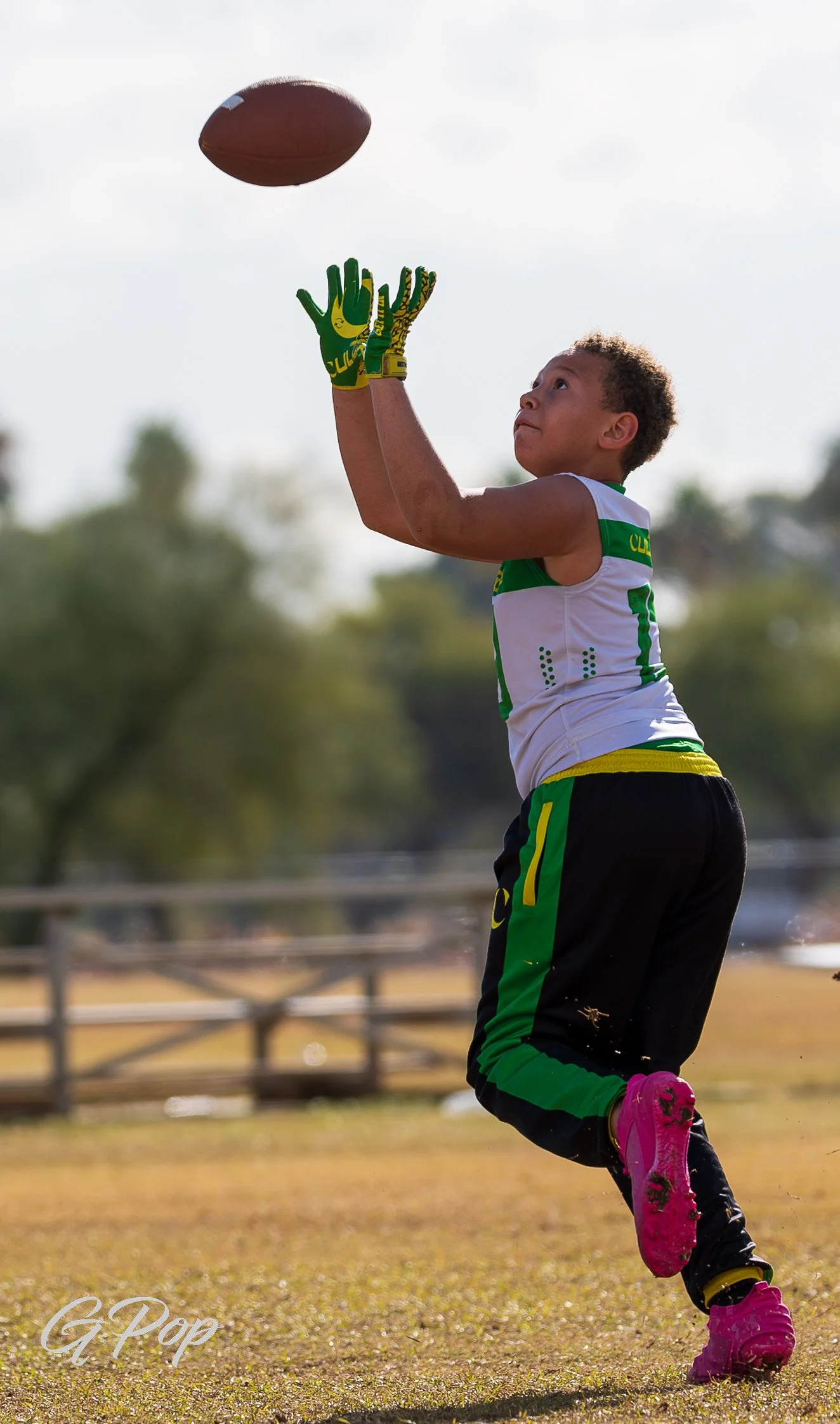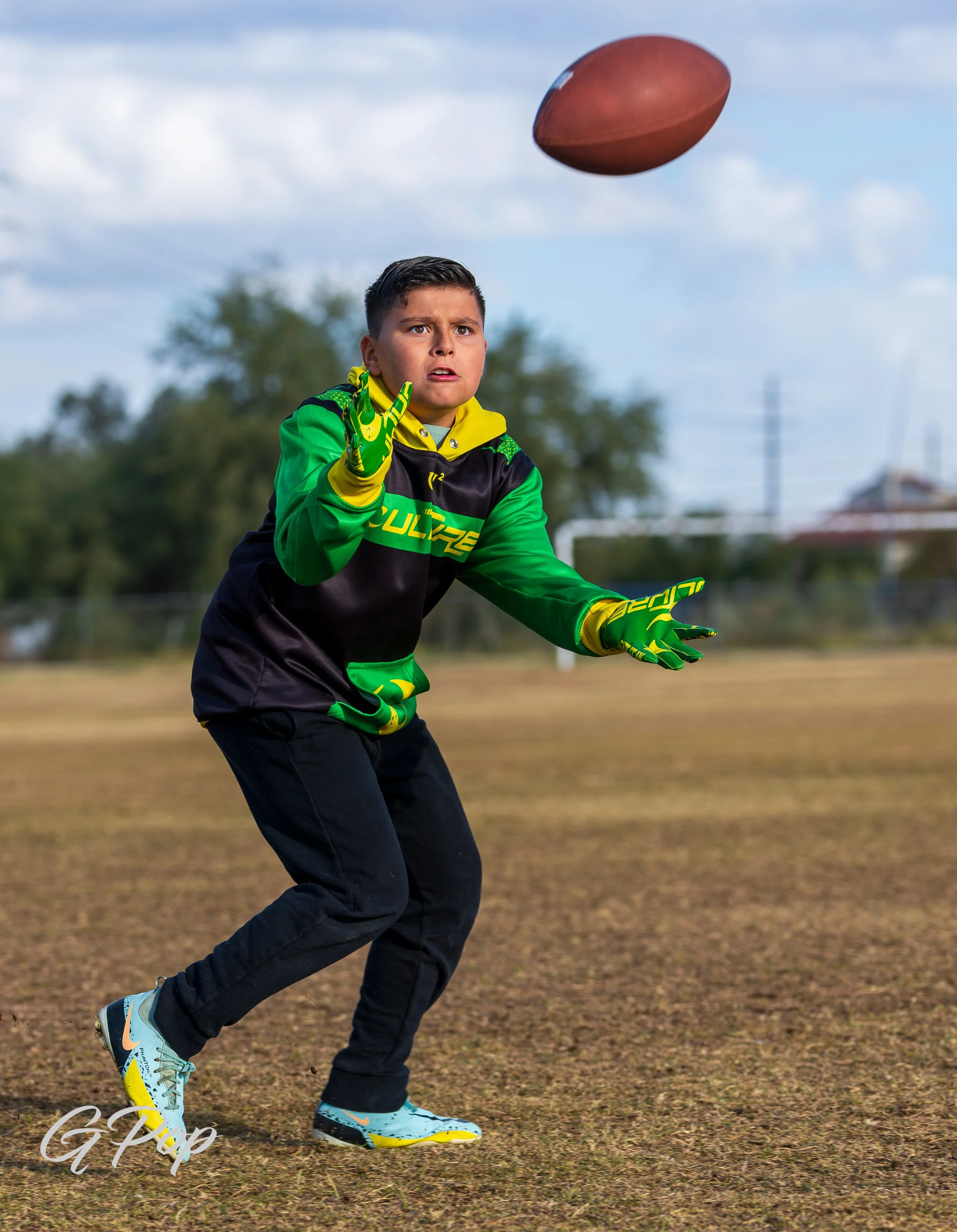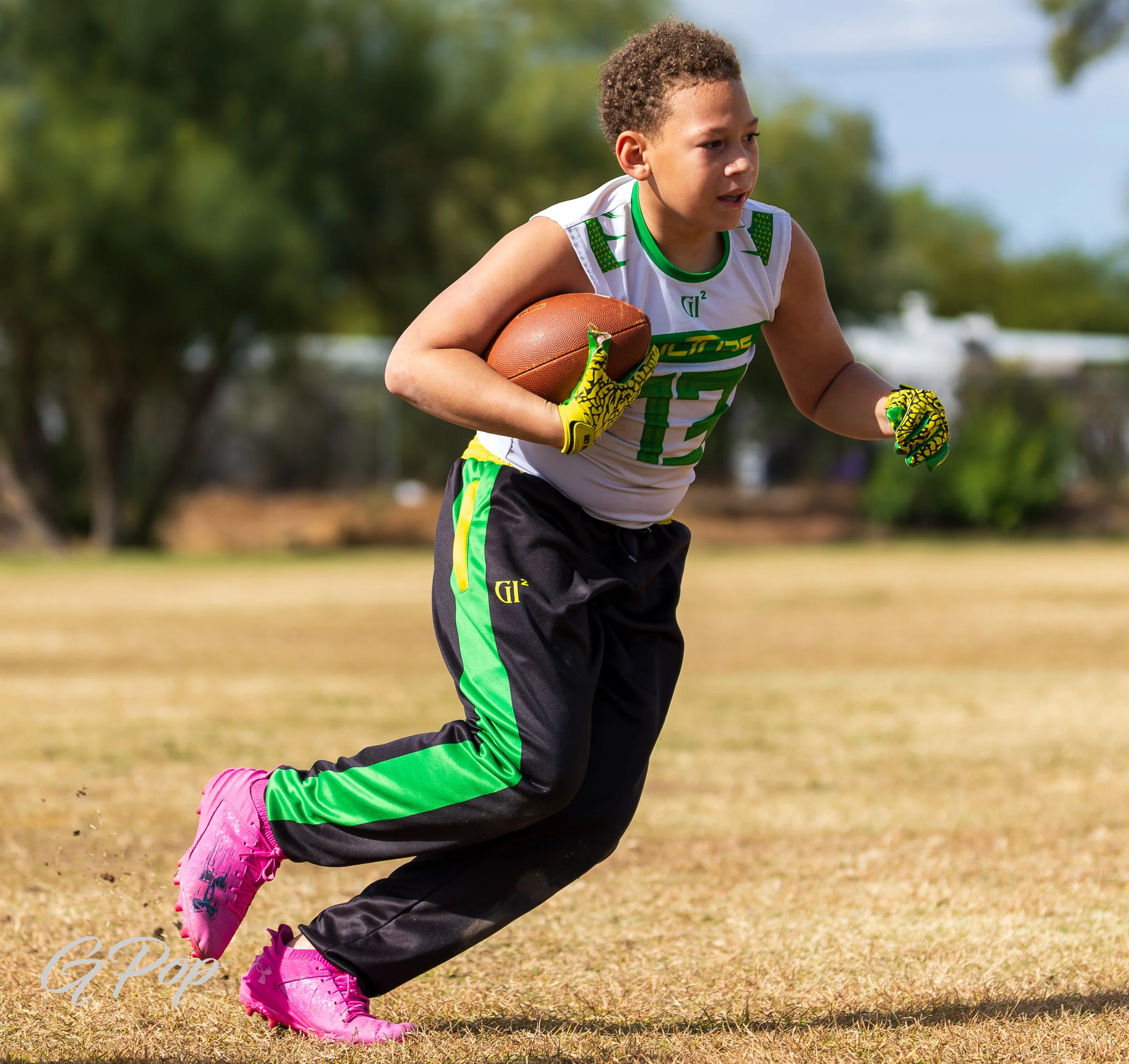 Young person in a football uniform holding a football on a field, with kids and a coach in the background.