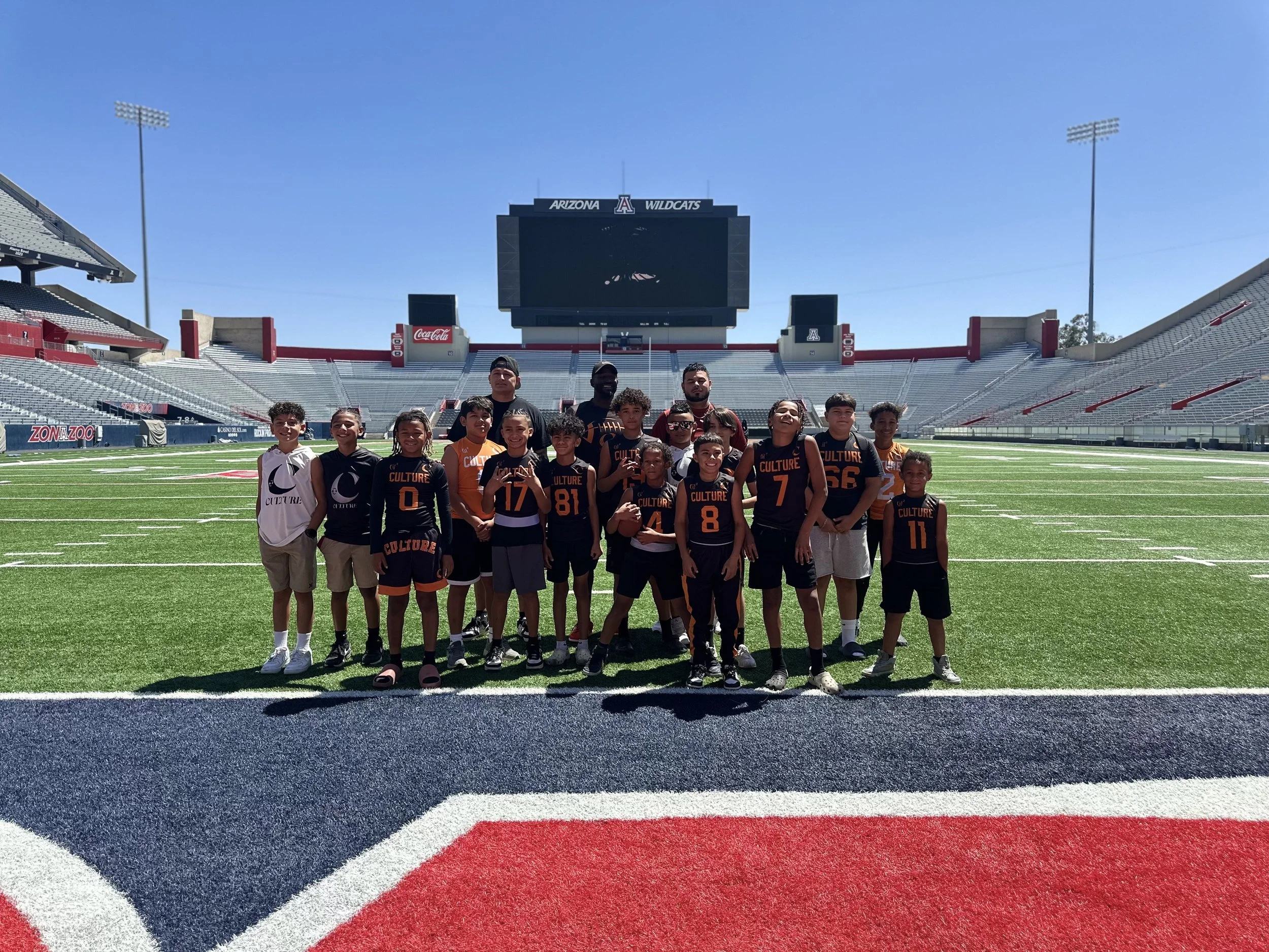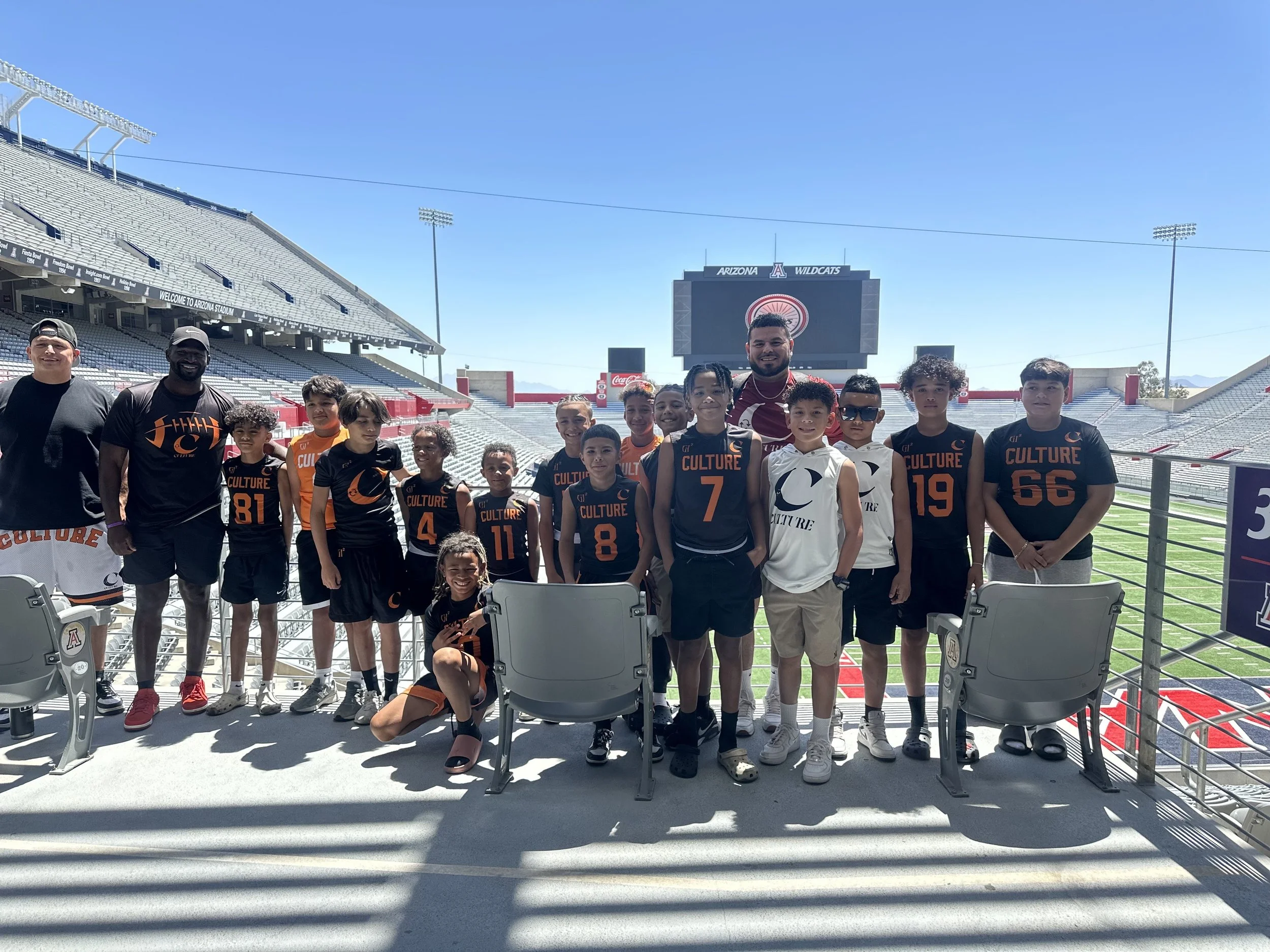 A group of young boys, coaches, and possibly older players standing on a football field inside a stadium. They are wearing sports jerseys with the word 'CULTURE' and various numbers. The stadium appears to be empty, with seating visible on both sides