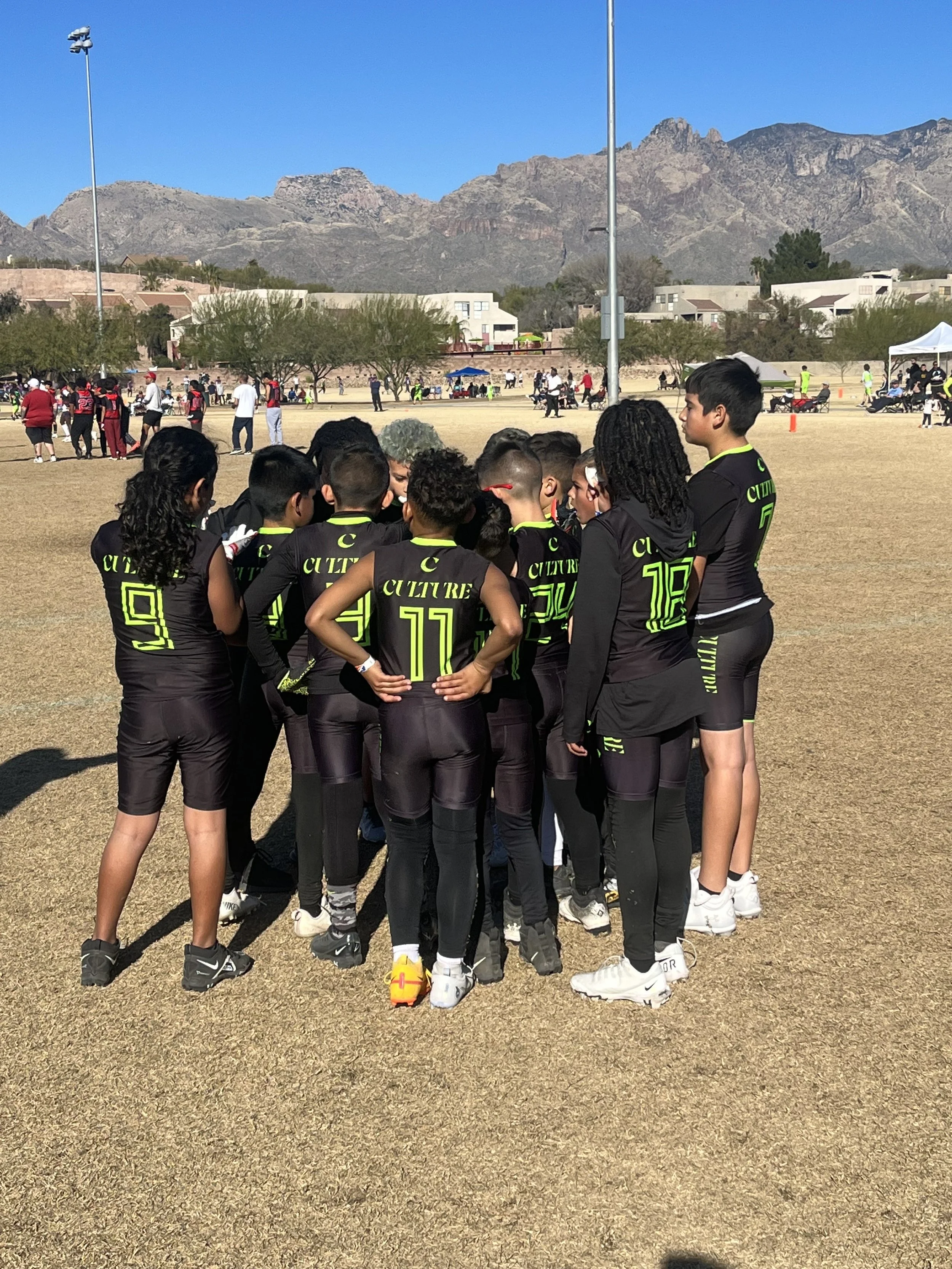 A youth football team in black uniforms with neon green accents and the word 'CULTURE' on the back, huddled together on a football field during a game or practice, with mountains in the background.