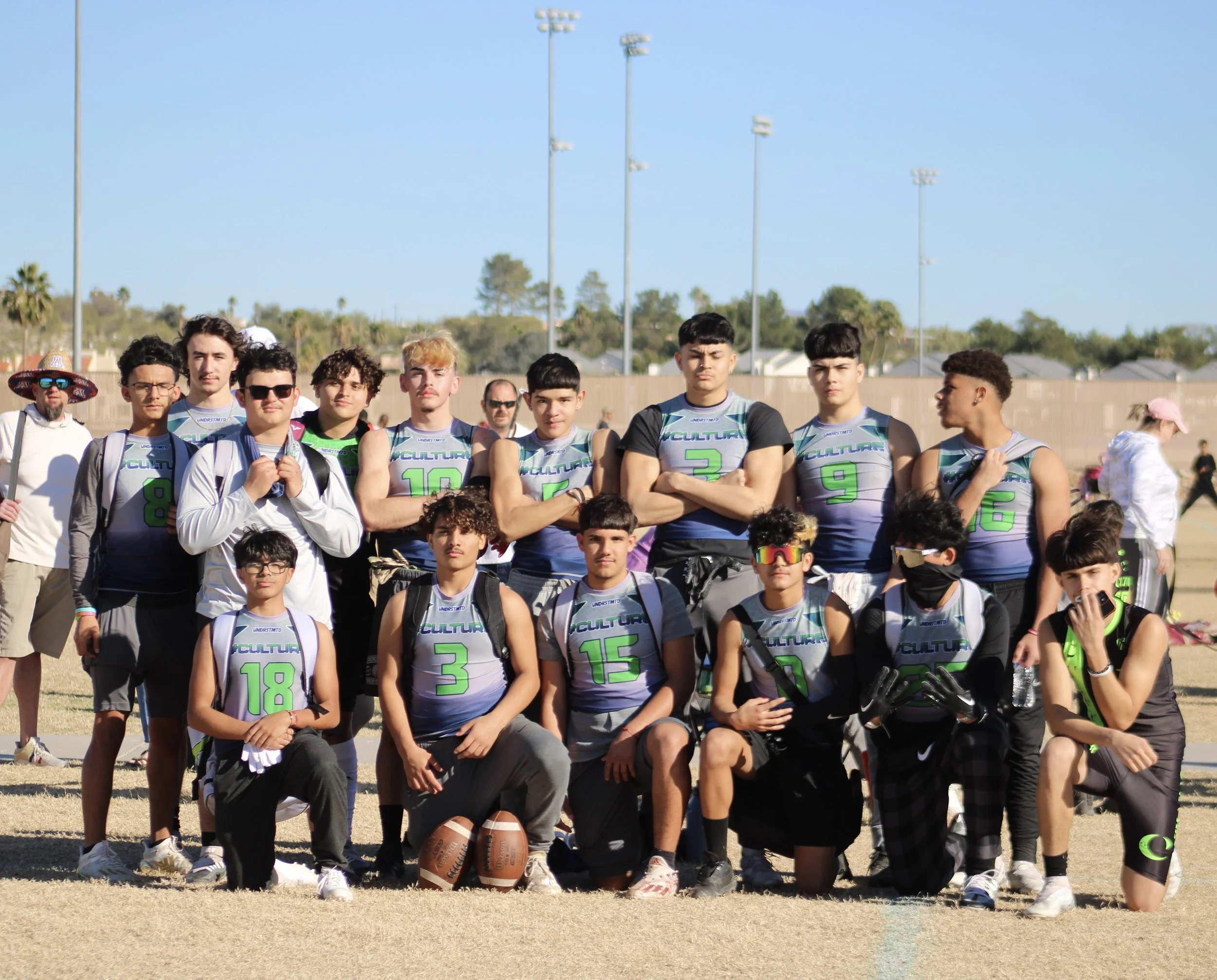 A group of young football players and coaches posing on a field during daytime, wearing sports uniforms and some with sunglasses or face masks.