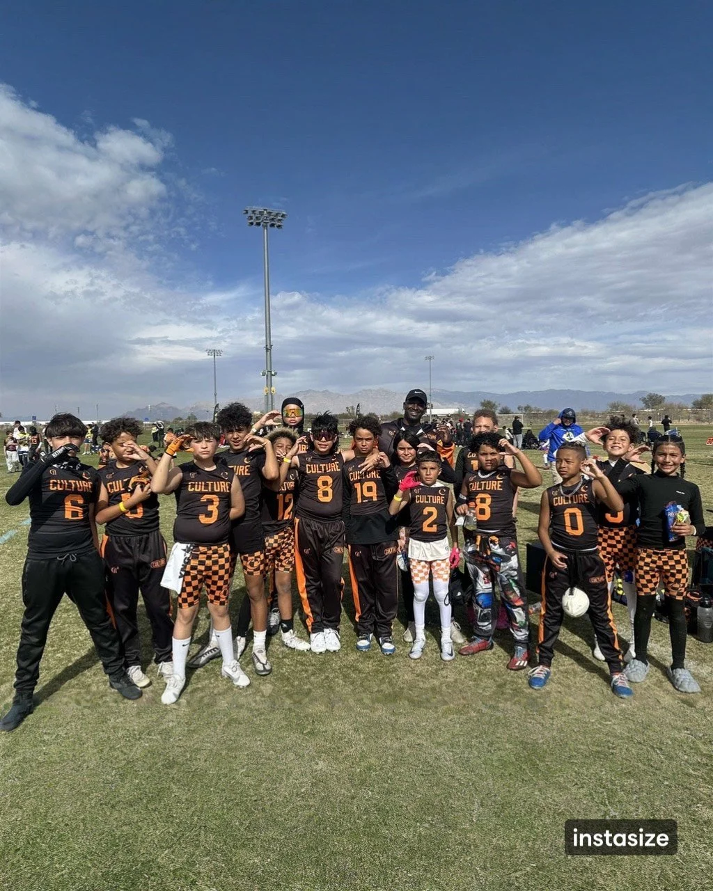 A youth football team poses on a field with their coaches before a game, wearing black jerseys with orange checkered patterns and numbers, saluting under a partly cloudy sky with stadium lights and mountains in the background.