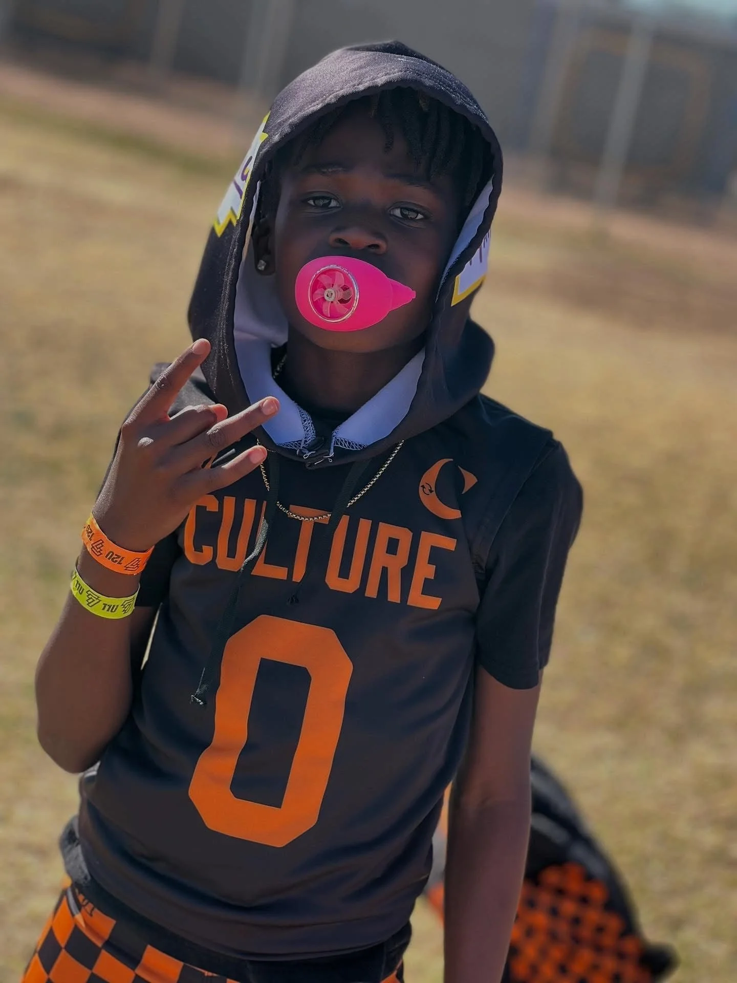 A young boy with dark skin and dreadlocks wearing a black sports jersey with orange letters and a large orange number 0, standing outdoors on a grassy field. He is wearing a gray hoodie and is blowing a pink bubble gum bubble. He has three wristbands