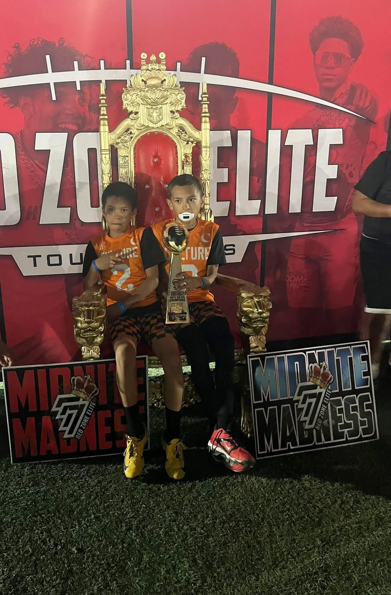 Two young boys sitting on a golden throne-like chair holding a trophy, wearing orange and black sports jerseys, with a red and black tournament banner in the background.