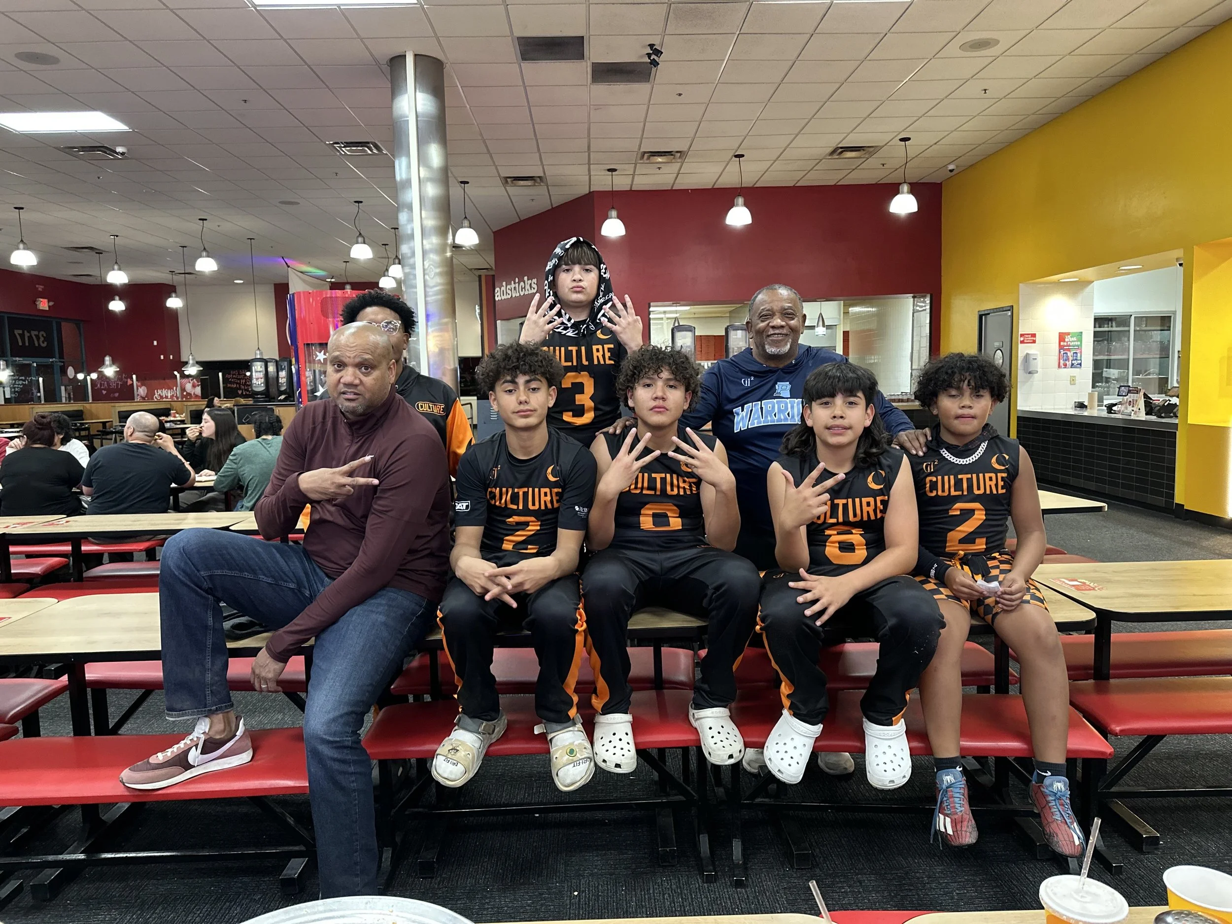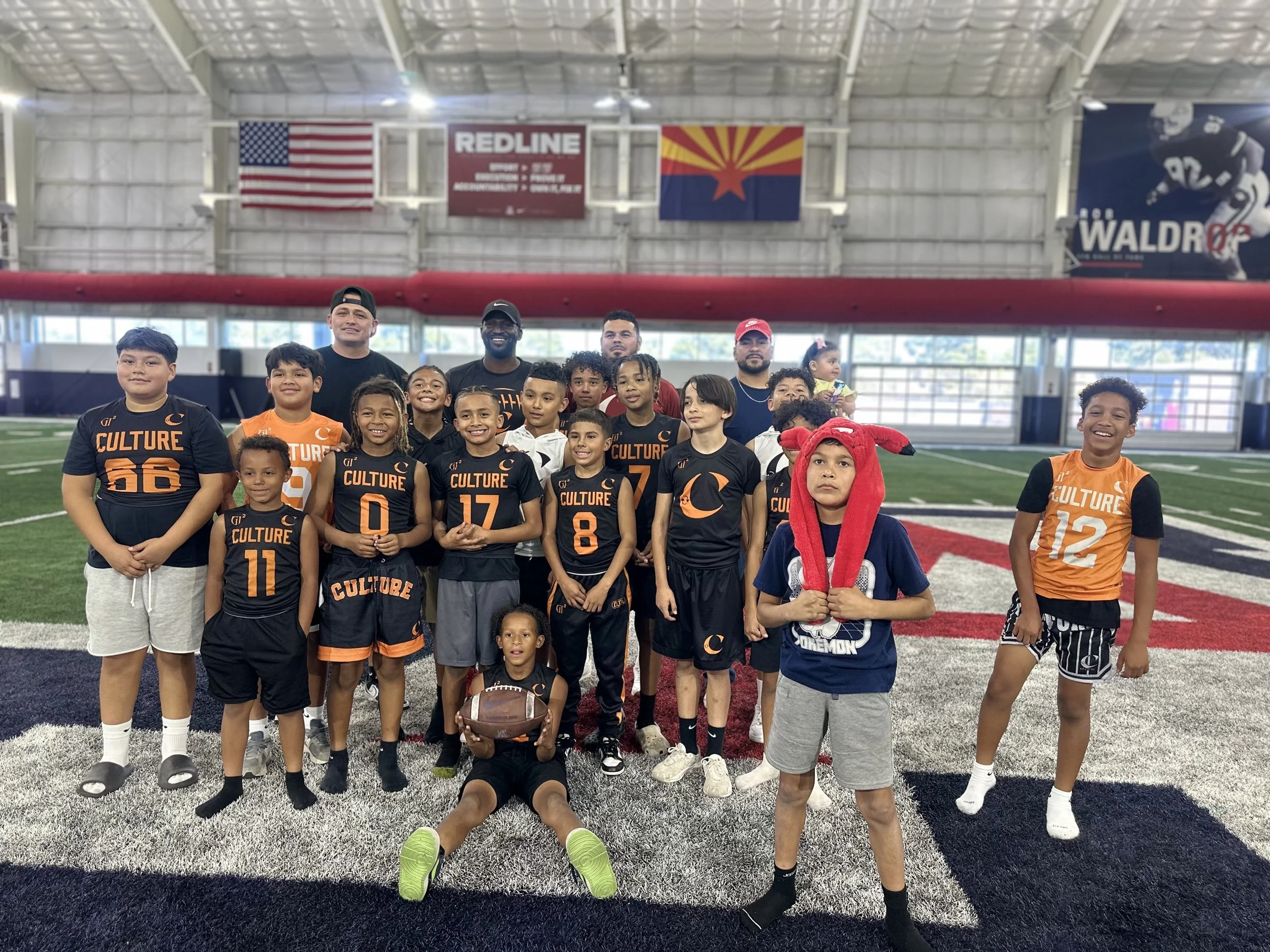 A group of young boys and coaches in an indoor football field, posing for a team photo. The boys are wearing black and orange sports jerseys with 'CULTURE' written on them; one boy is holding a football, and a girl is wearing a Pokémon sweatshirt. Th
