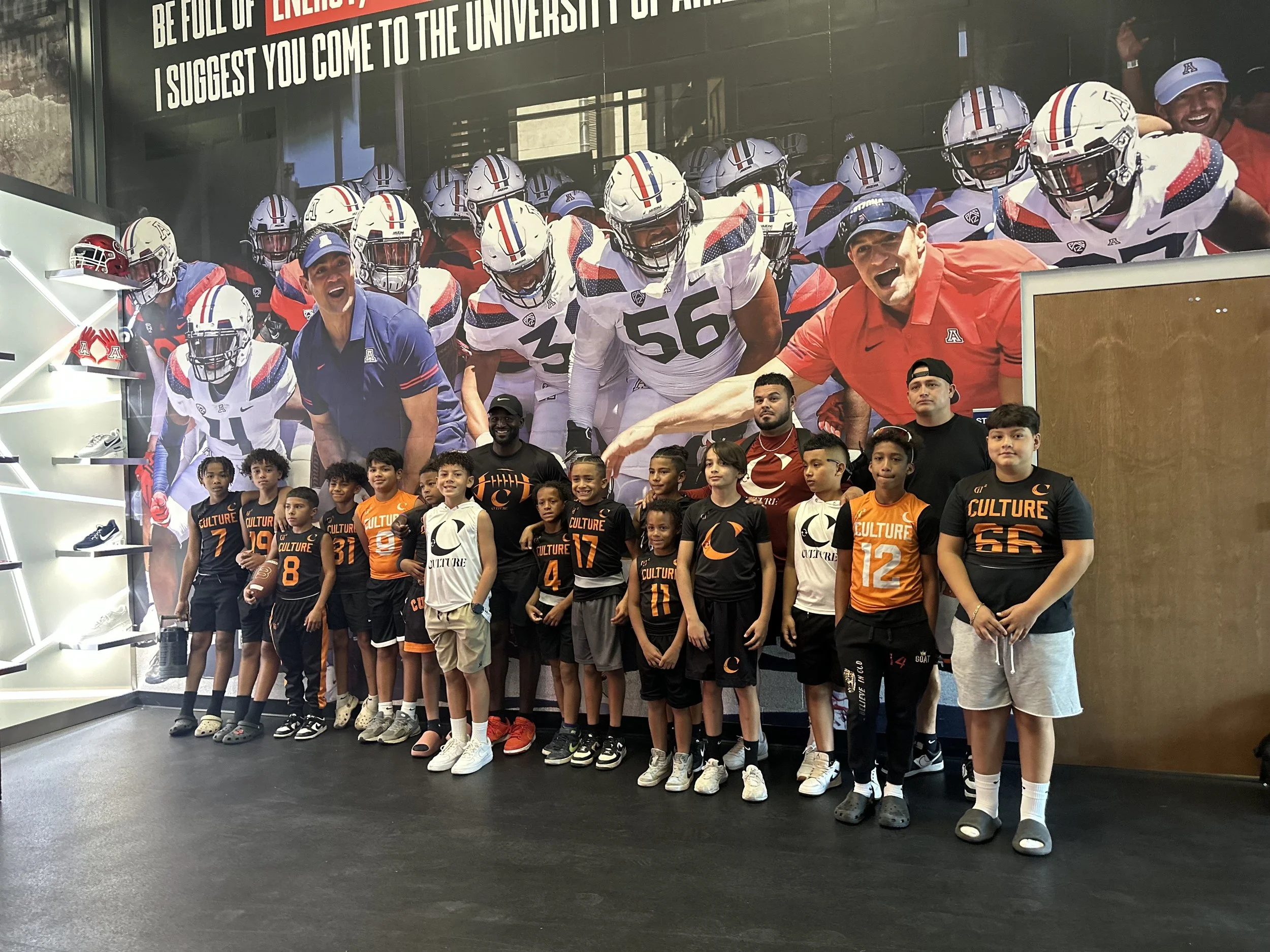 Group of children standing in front of a large mural of football players and coaches at the University of Arizona, wearing football jerseys and shorts.