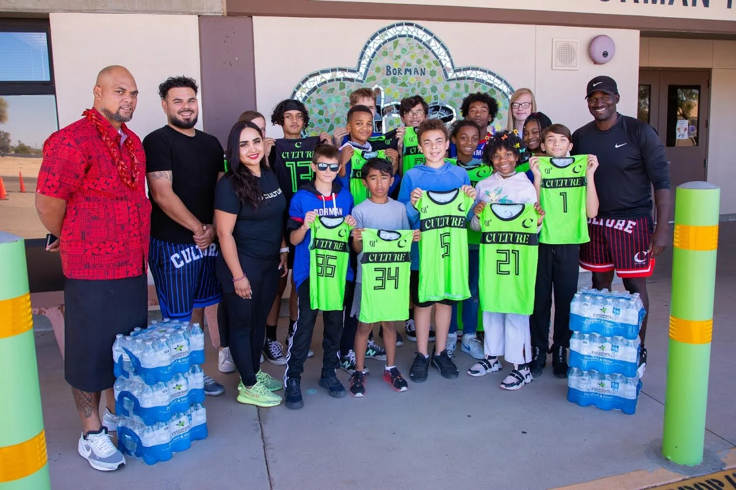 Group of children and adults posing outside with kids holding green basketball jerseys. Bottled water stacked on either side. Building with decorative mosaic in the background.