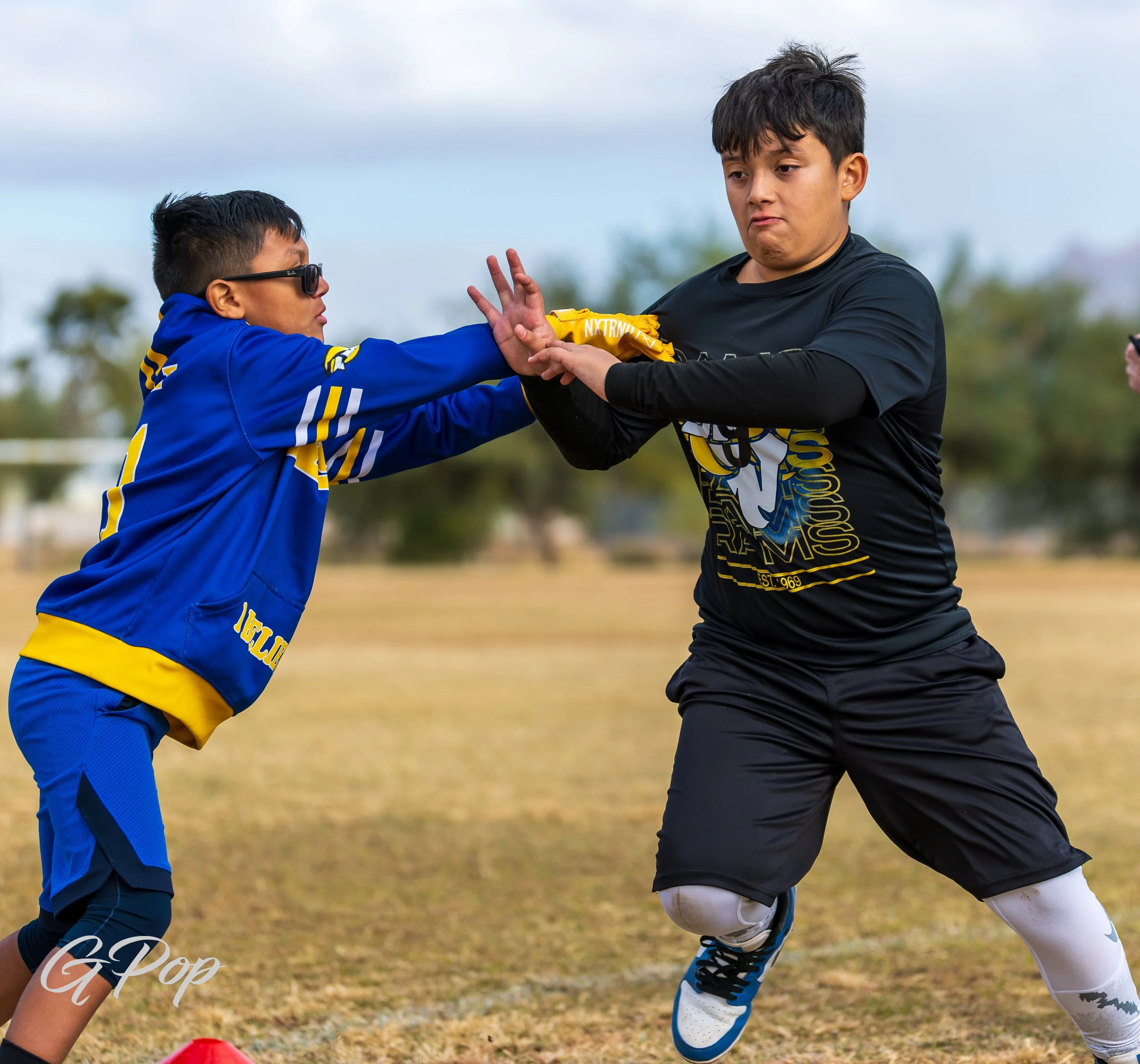 Children playing flag football on a field, wearing black jerseys with orange letters and numbers, with spectators and tents in the background under clear blue skies.
