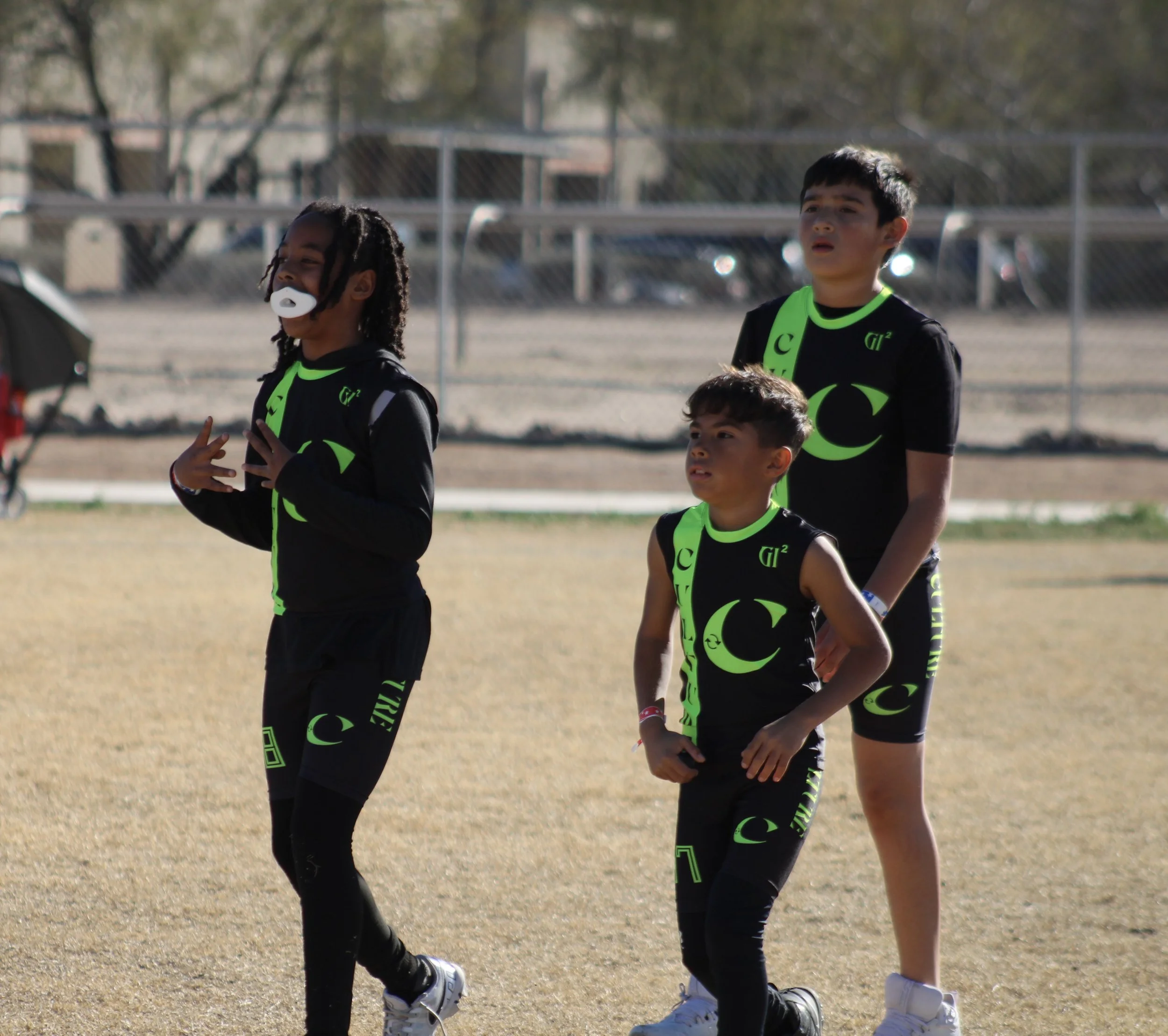 Three children standing on a field wearing matching black and neon green sports outfits, with a chain-link fence and some trees in the background, possibly during a sports event or practice.