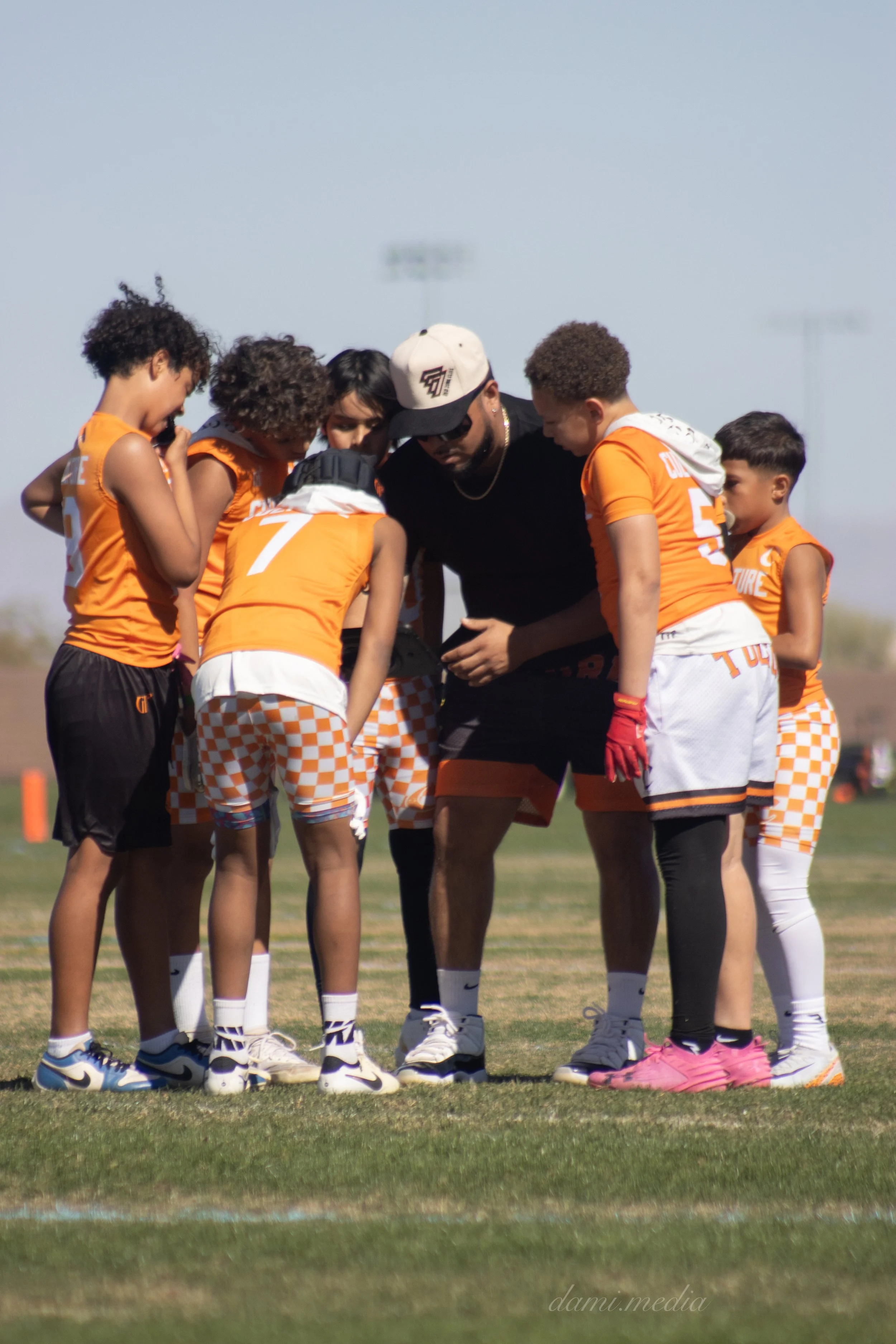 A youth football team in orange jerseys huddles around their coach on the field during a game, under a clear sky.