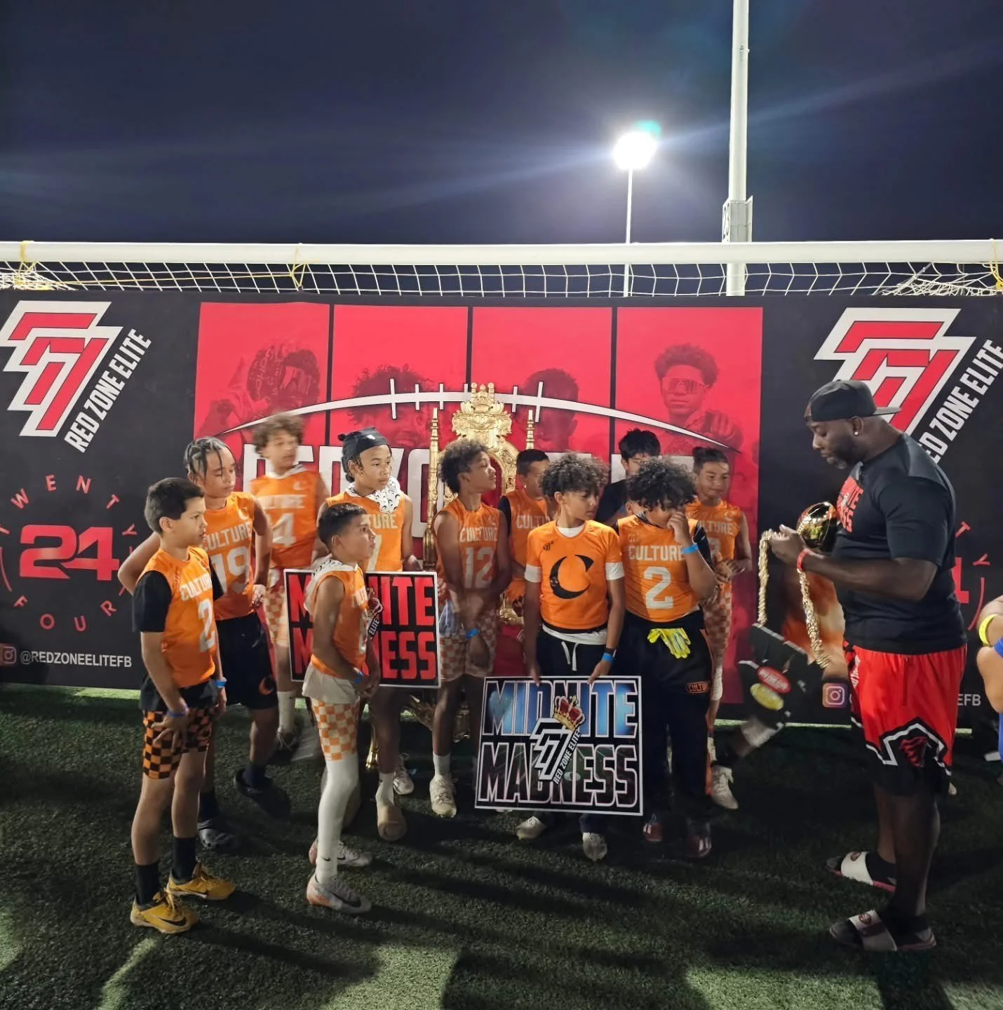 Youth football team in orange jerseys on field with a coach holding a trophy, celebrating their victory during night game, backdrop displays 'Midnite Madness' and 'Red Zone Elite' logos.