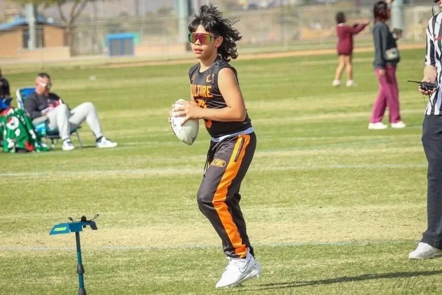 A young girl playing American football outdoors on a grassy field, dressed in athletic gear with sunglasses, holding a football, with other people in the background.