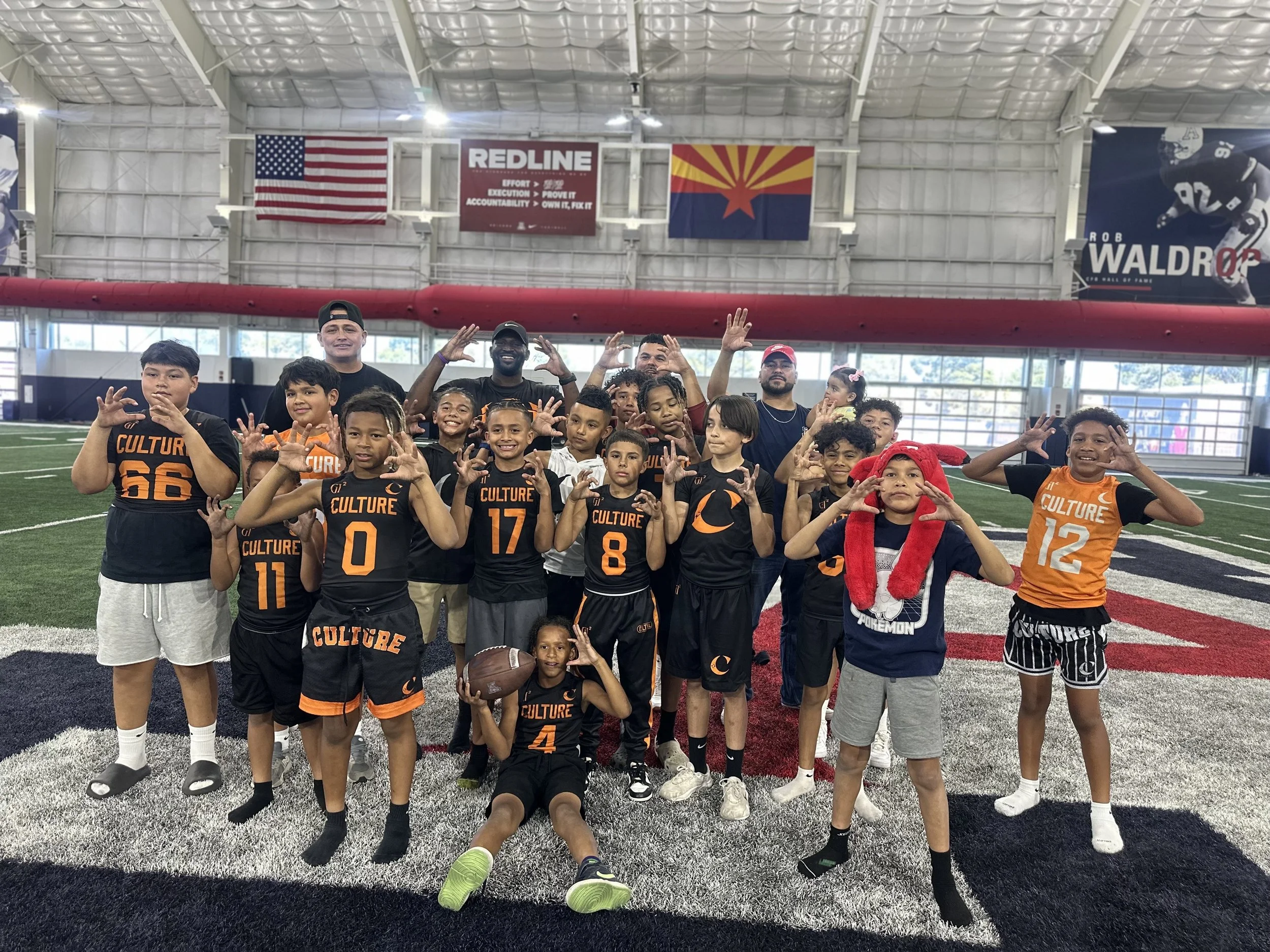 Group of young football players and coaches posing on an indoor football field. They are making a hand gesture, with some wearing black and orange team jerseys. The background includes American and Arizona state flags, with banners and a large window
