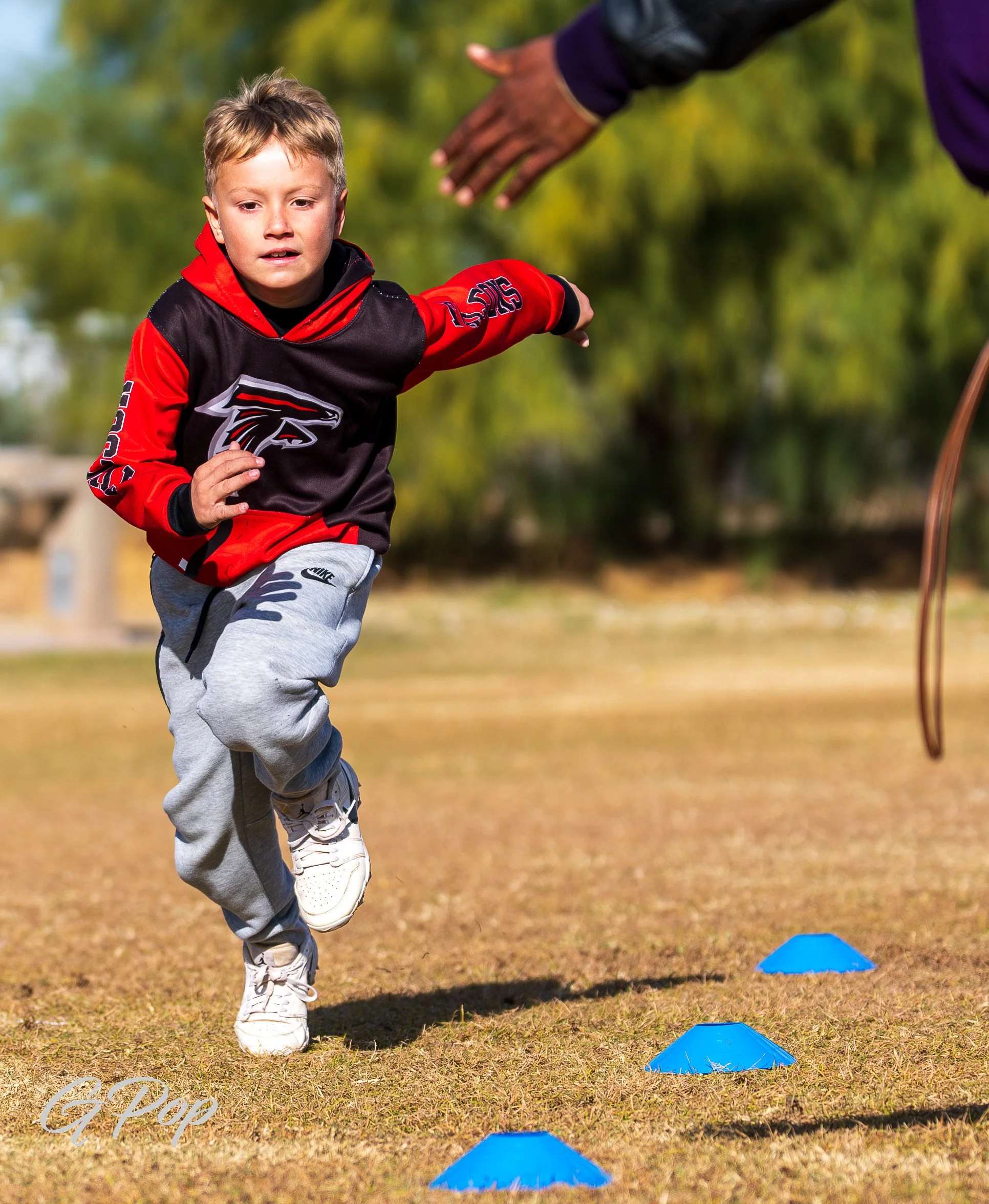 Young football player practicing on a field, with children and spectators in the background.
