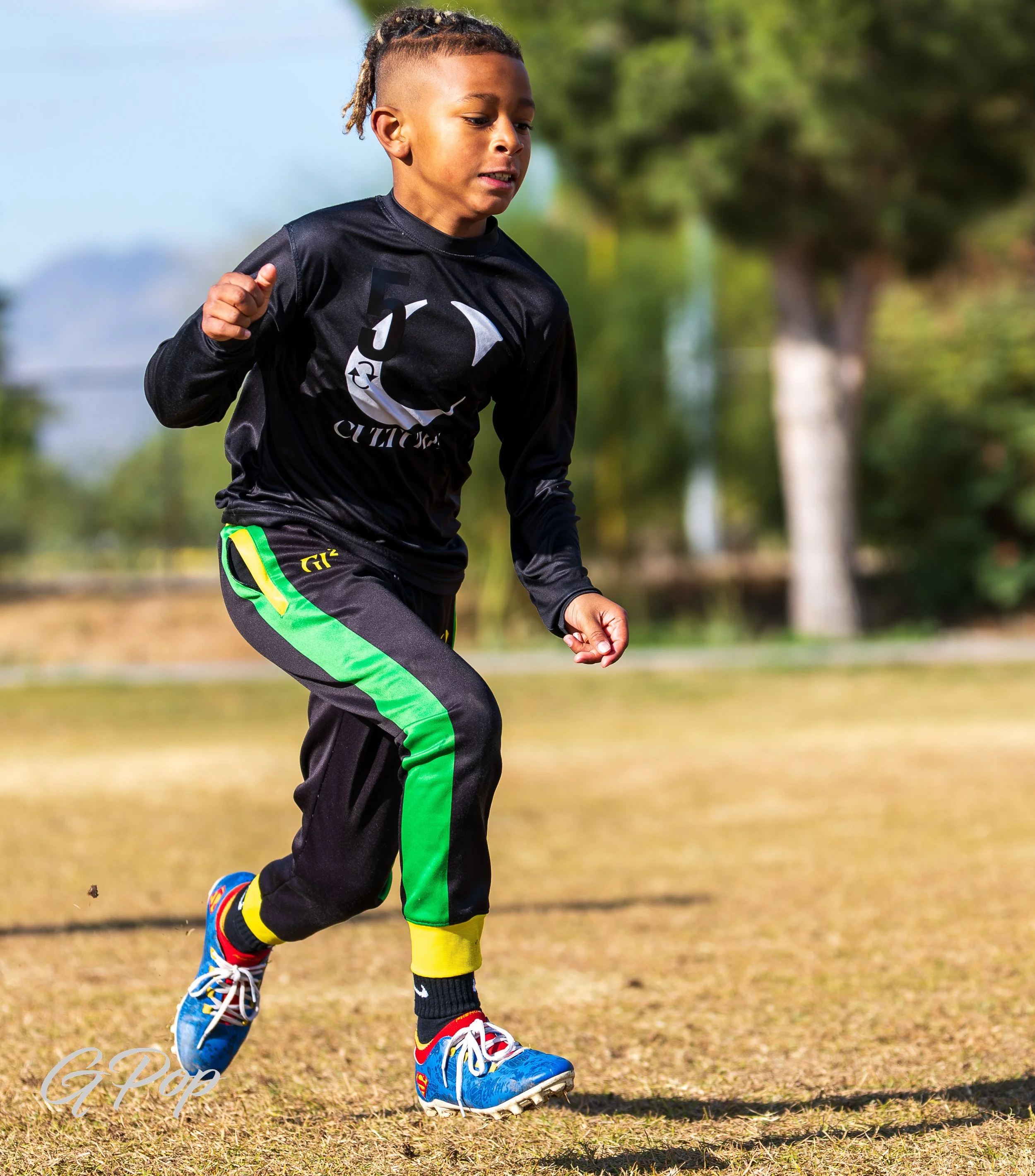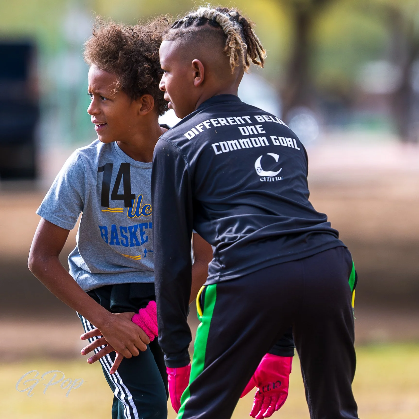 Two young boys dressed in bright green sports uniforms with the word 'CULTURE' on the front, standing outdoors on a grassy field.