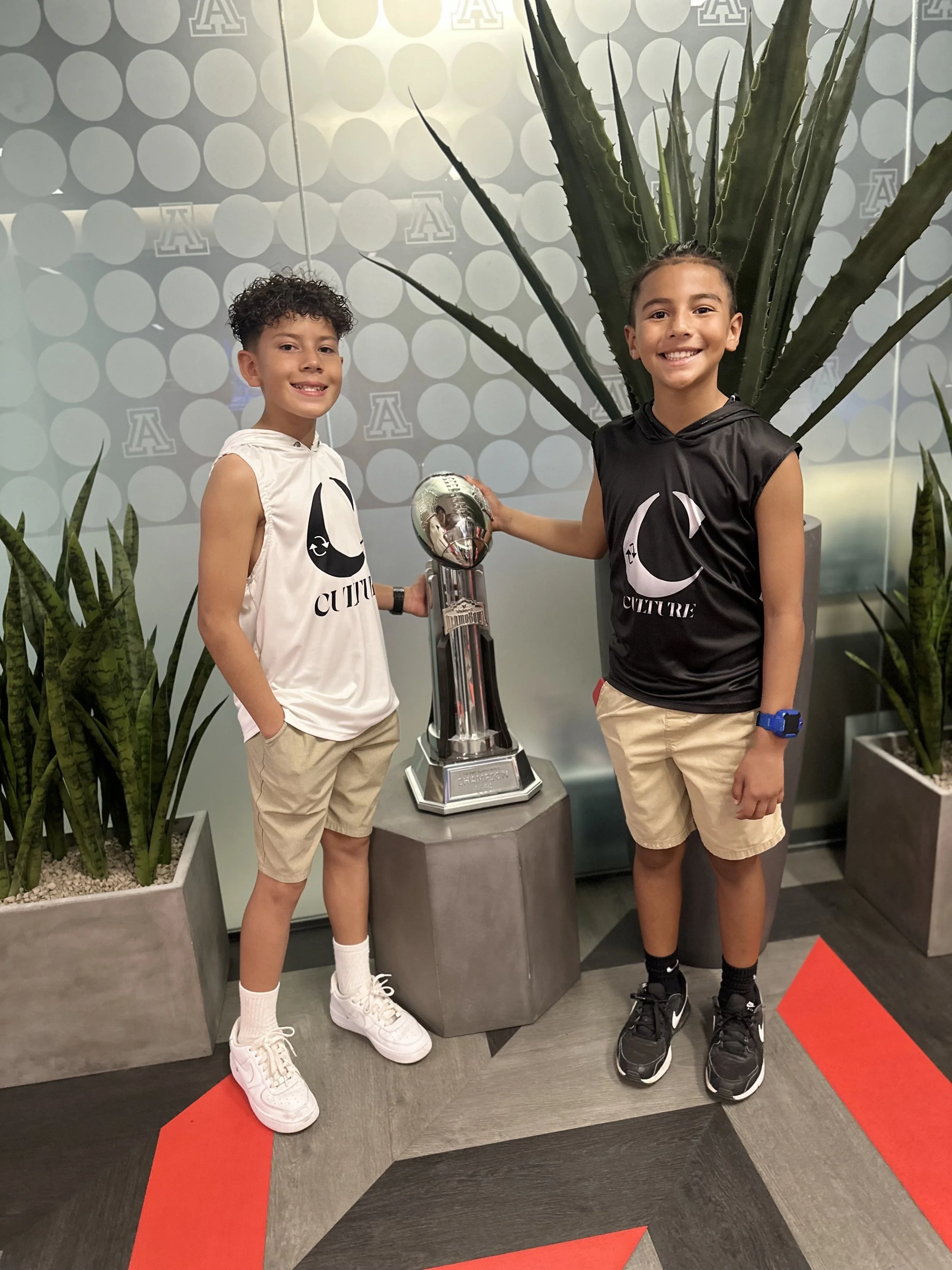 Two children, a boy and a girl, smiling and standing next to a trophy on a pedestal, with a large plant behind them. Both are wearing sleeveless shirts with a moon and star logo, khaki shorts, and sneakers.