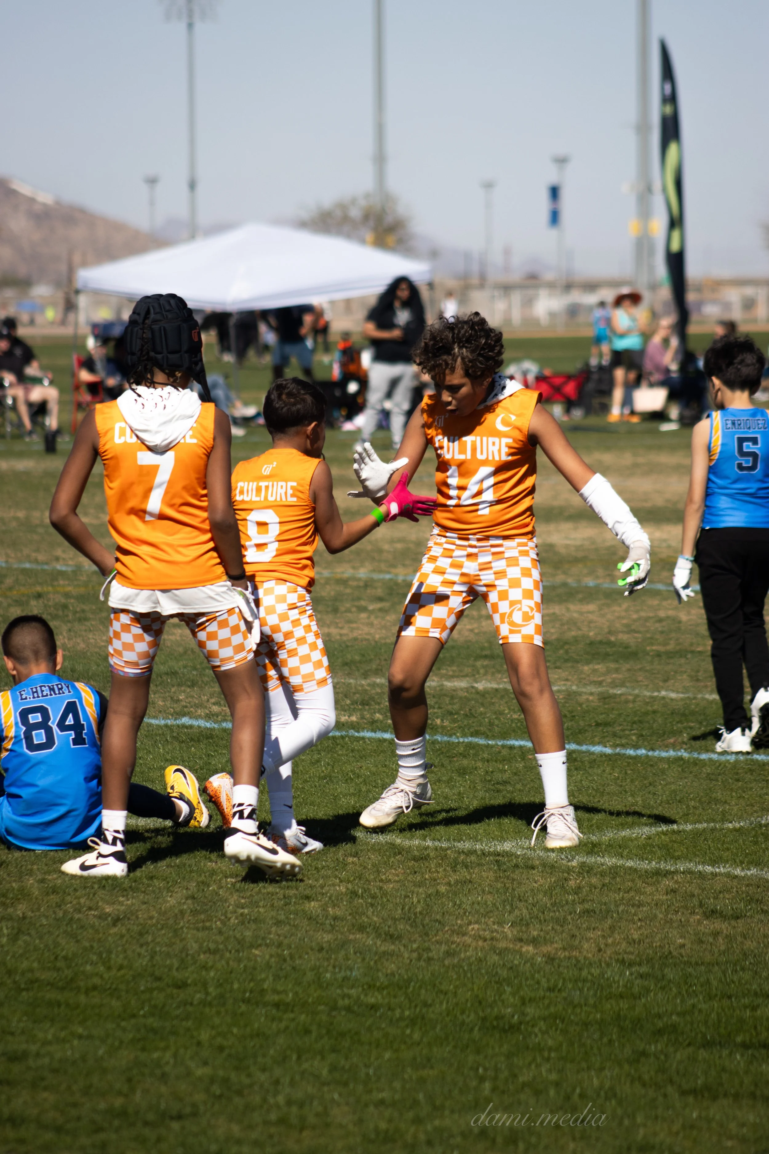 Young kids on a flag football field celebrating a point, wearing orange and white jerseys with numbers and checkered patterns, with others in the background playing.