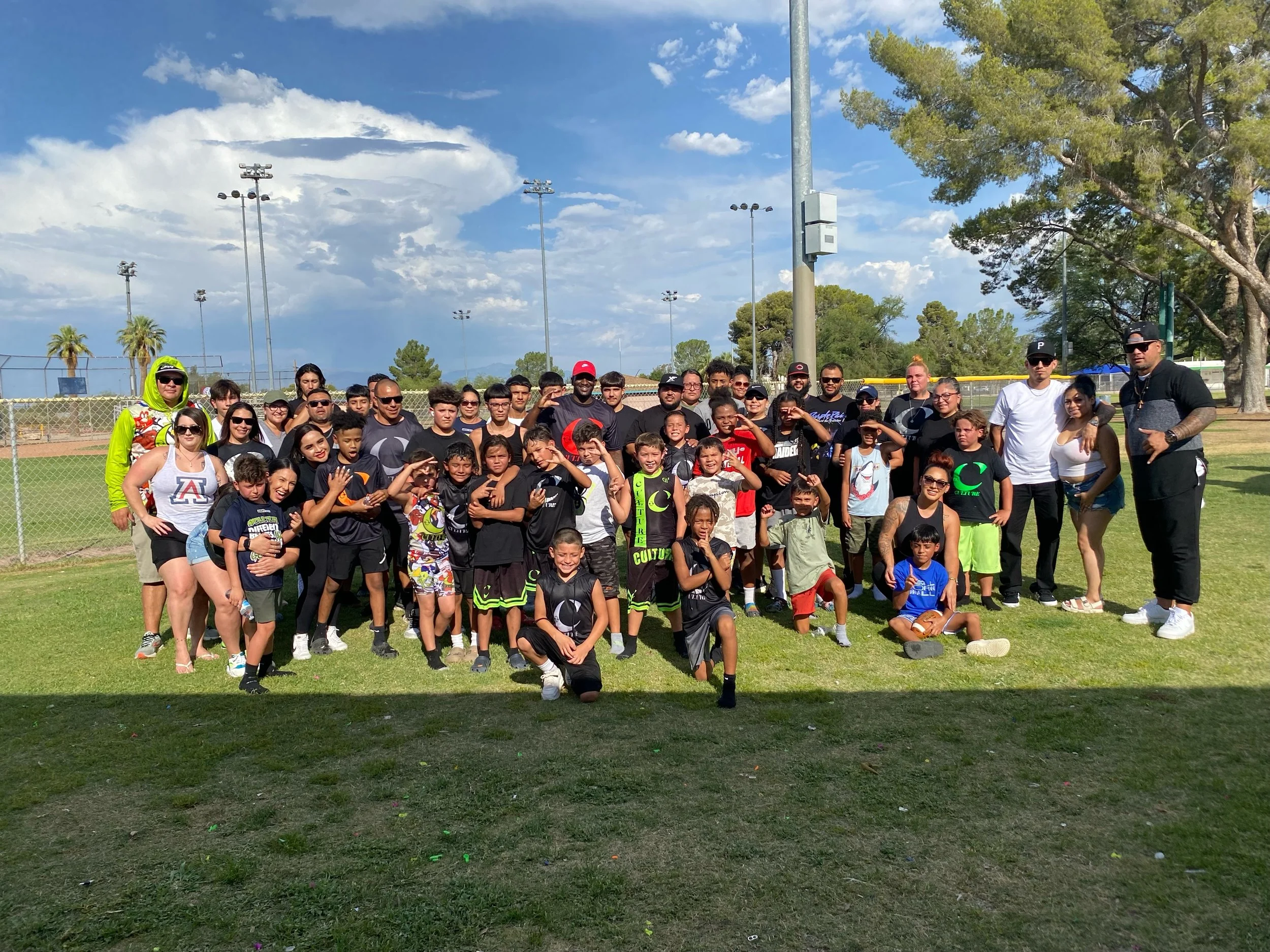 Group of children and adults posing for a photo on a grassy field at a park or sports field, with trees, fences, and light poles in the background on a sunny day with partly cloudy sky.