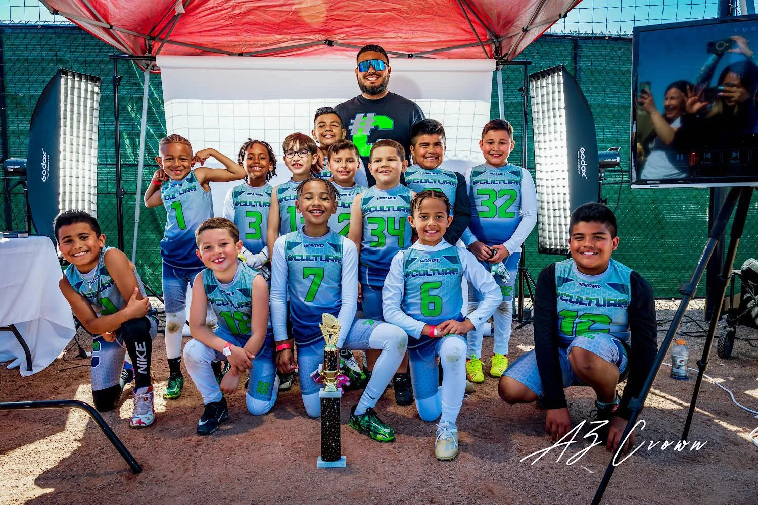 Group of young boys and girls in matching sports uniforms, posing with a coach or adult, in an outdoor setting with sports equipment and a trophy in front, celebrating a sports victory.