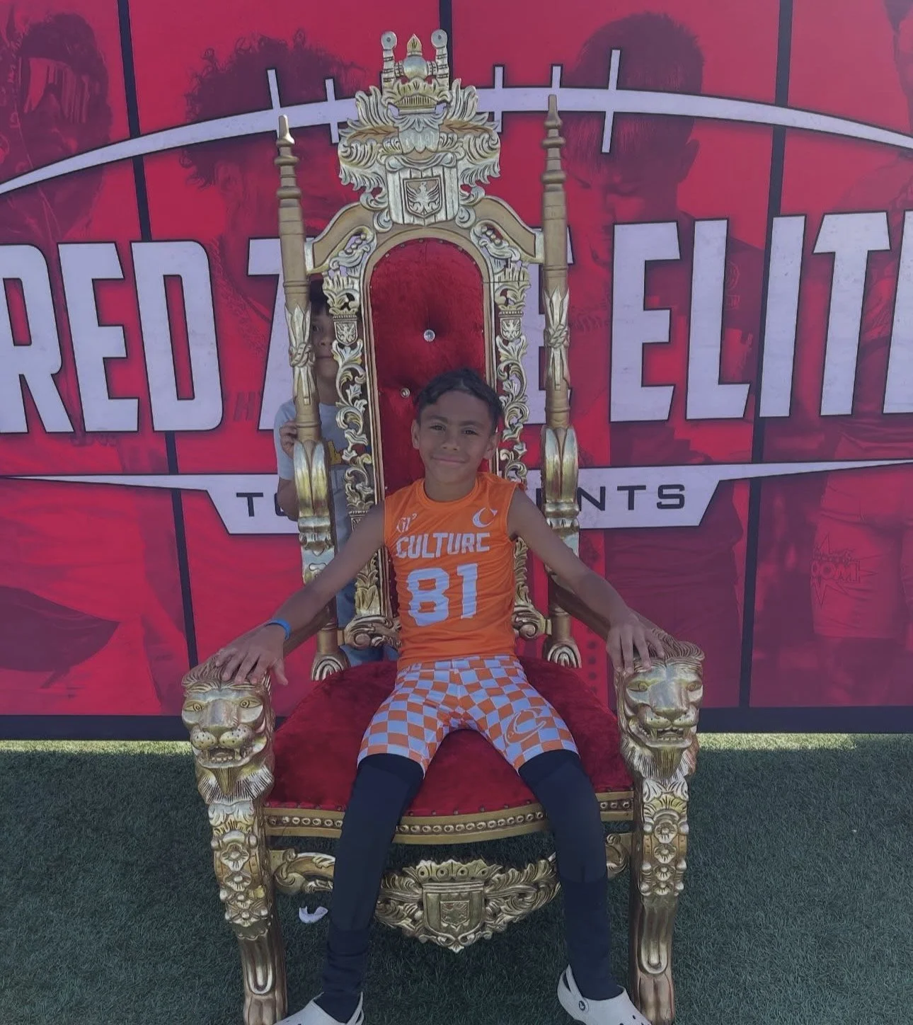 Young boy sitting on an ornate red and gold throne in front of a Red Elite banner, wearing an orange basketball jersey and checkered shorts.